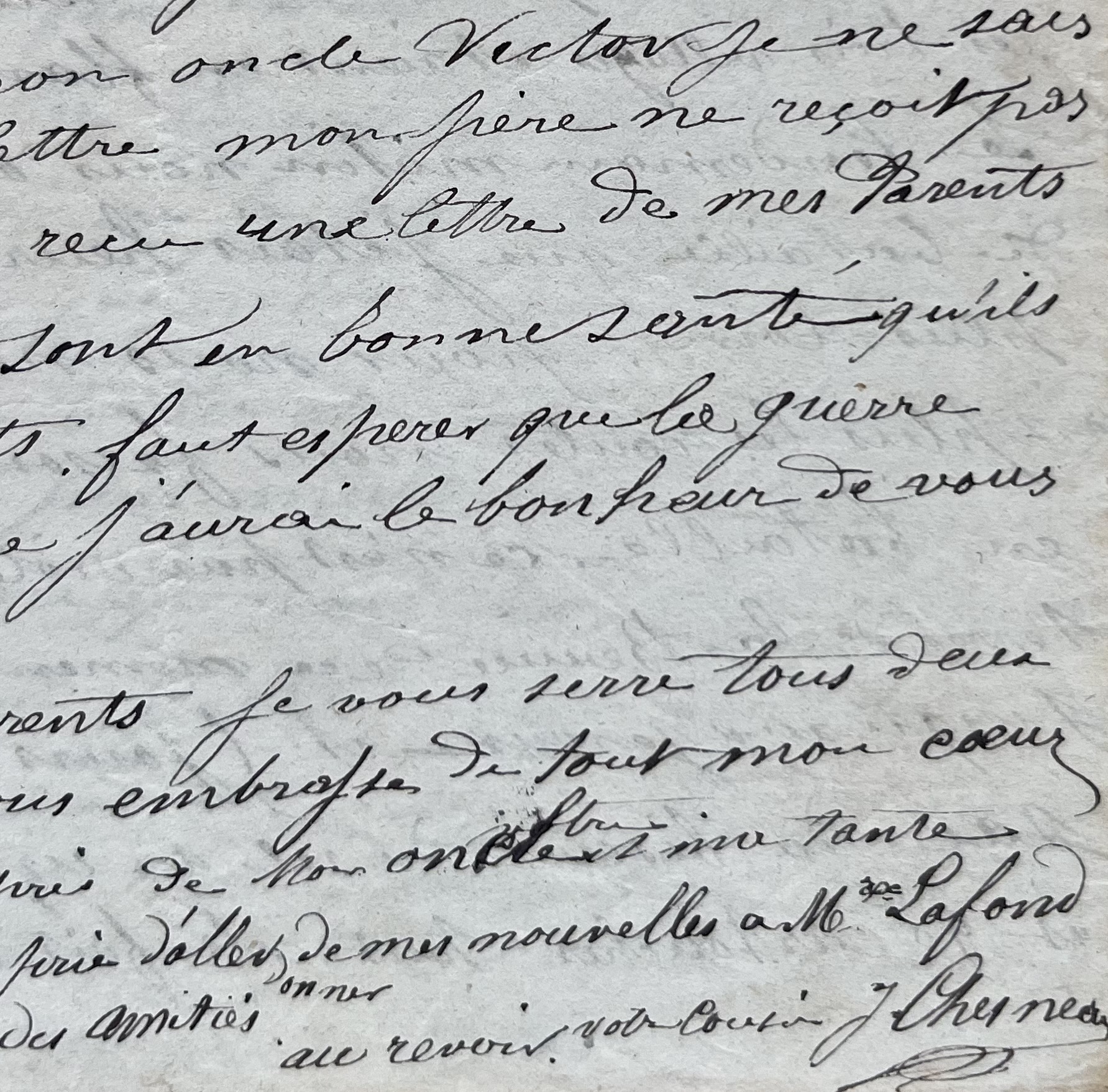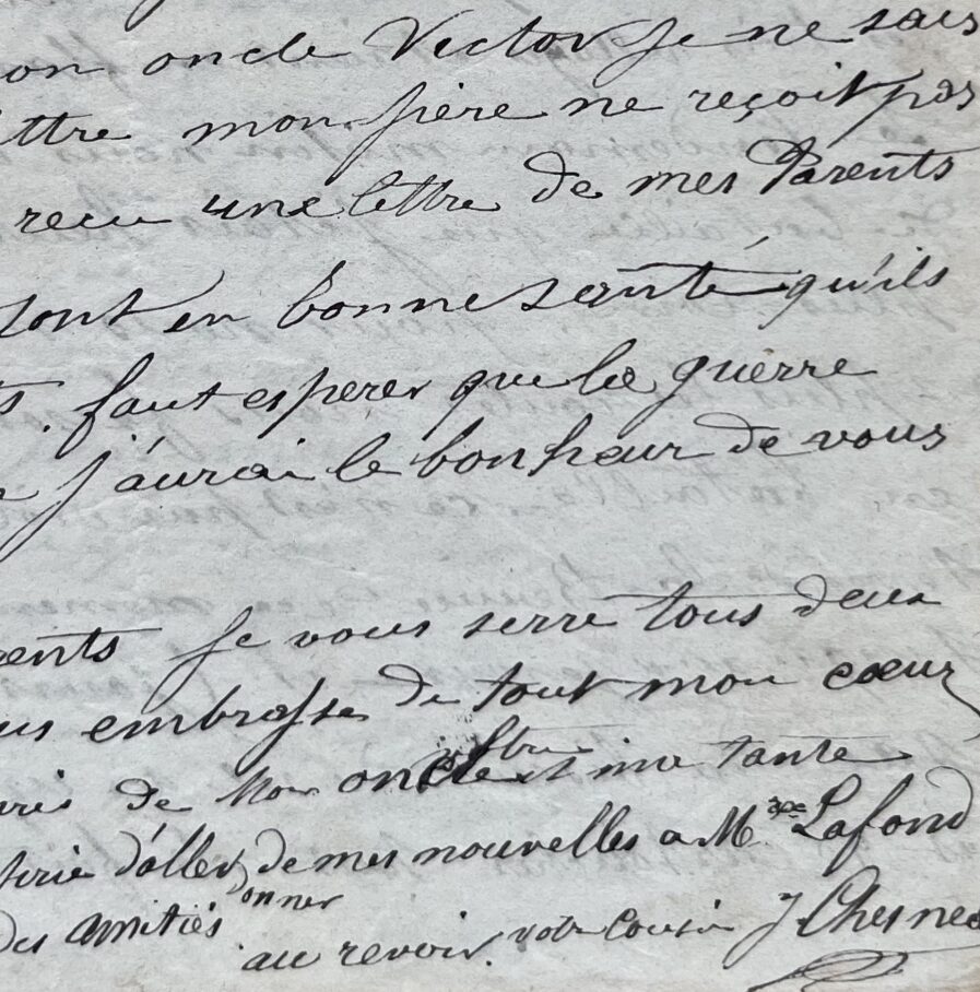 Très émouvante et intéressante lettre d'un soldat nommé J. Chesneau de la garde mobile, toute consacrée à la bataille de Coulmiers (9 novembre) à laquelle il participa. Il raconte les circonstances, le déroulement et l'horrible spectacle du champ de bataille.