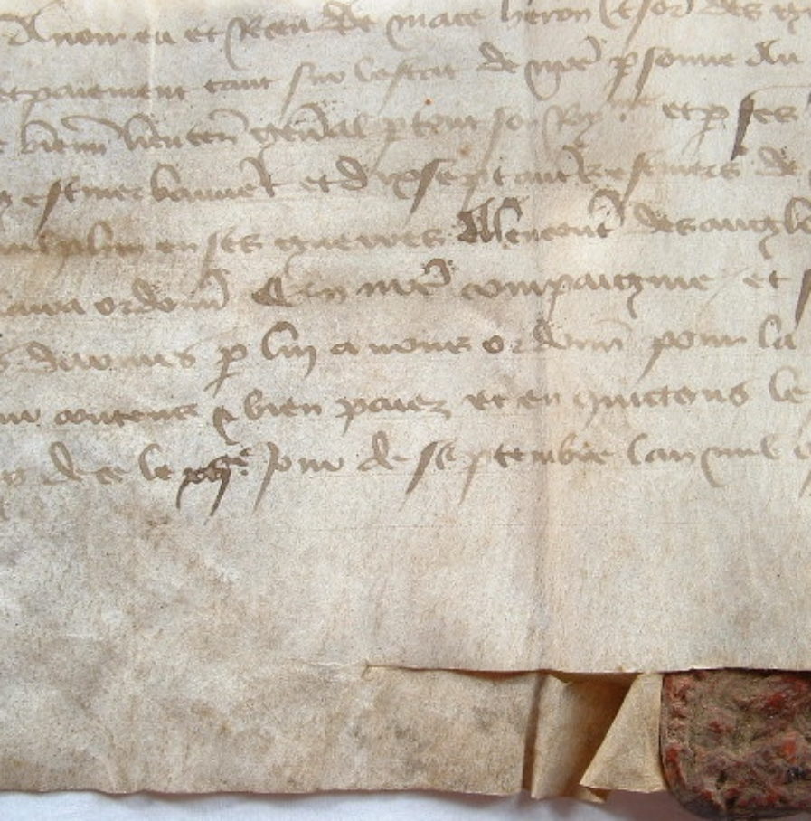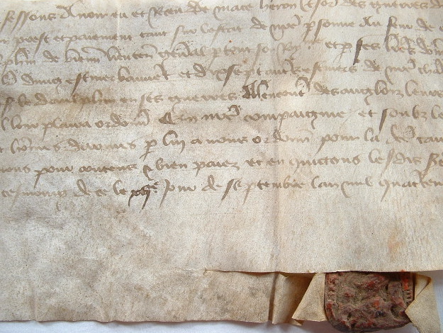 Charte scellée par un sceau de cire rouge sous simple queue (2,5 cm, complet, empreinte faible).