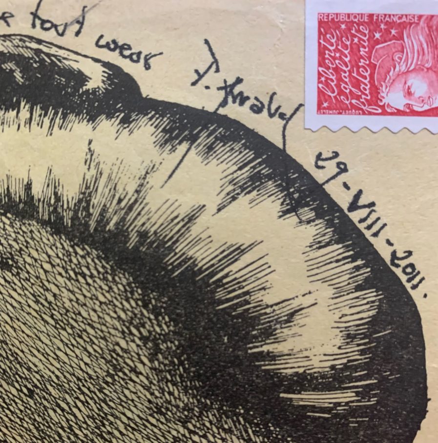 A même le document, il a inscrit l'adresse (la soulignant par des traits de crayon gras) et collé le timbre.