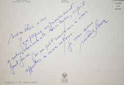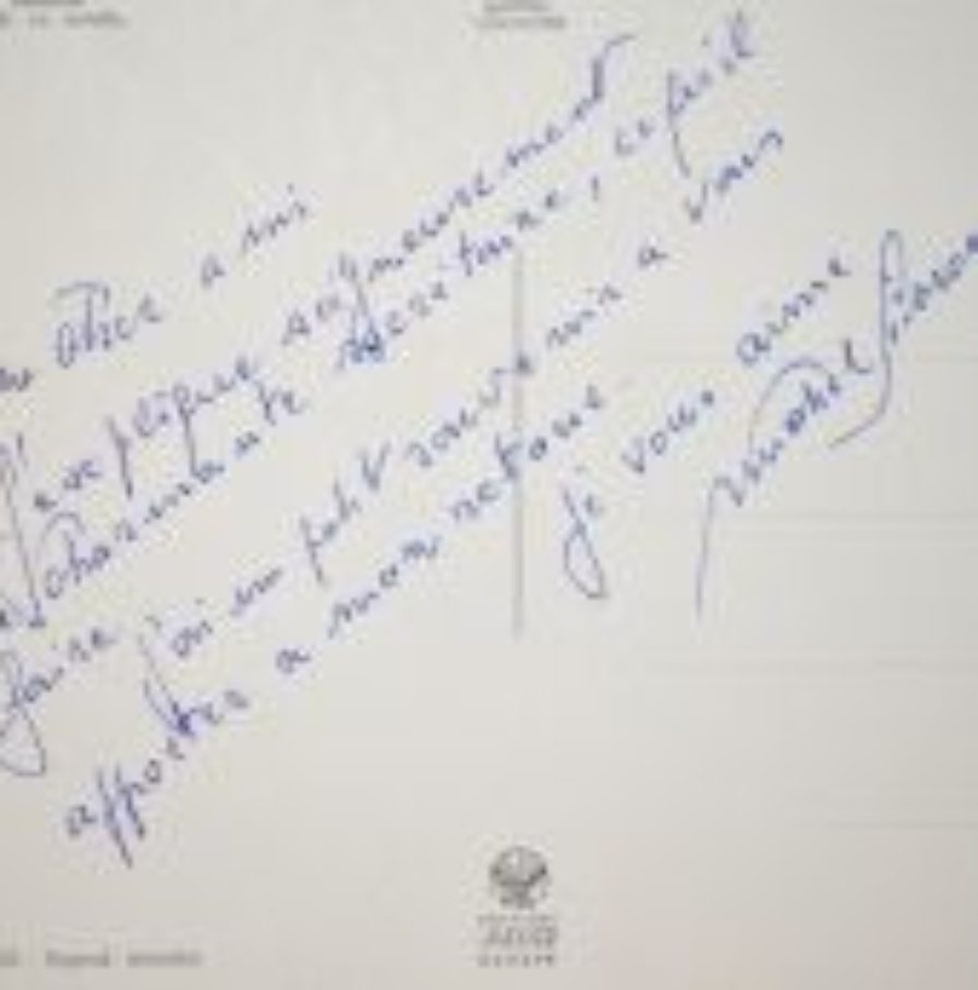 Au dos d'une carte postale représentant un cygne et ses petits sur le lac Leman, Michel Simon écrit cet énigmatique message : "Mon cher ami, j'explique soigneusement à votre charmante secrétaire ce qu'il faut faire. J'ai un petit souvenir à vous apporter à mon retour. Je vous aime. Michel Simon".