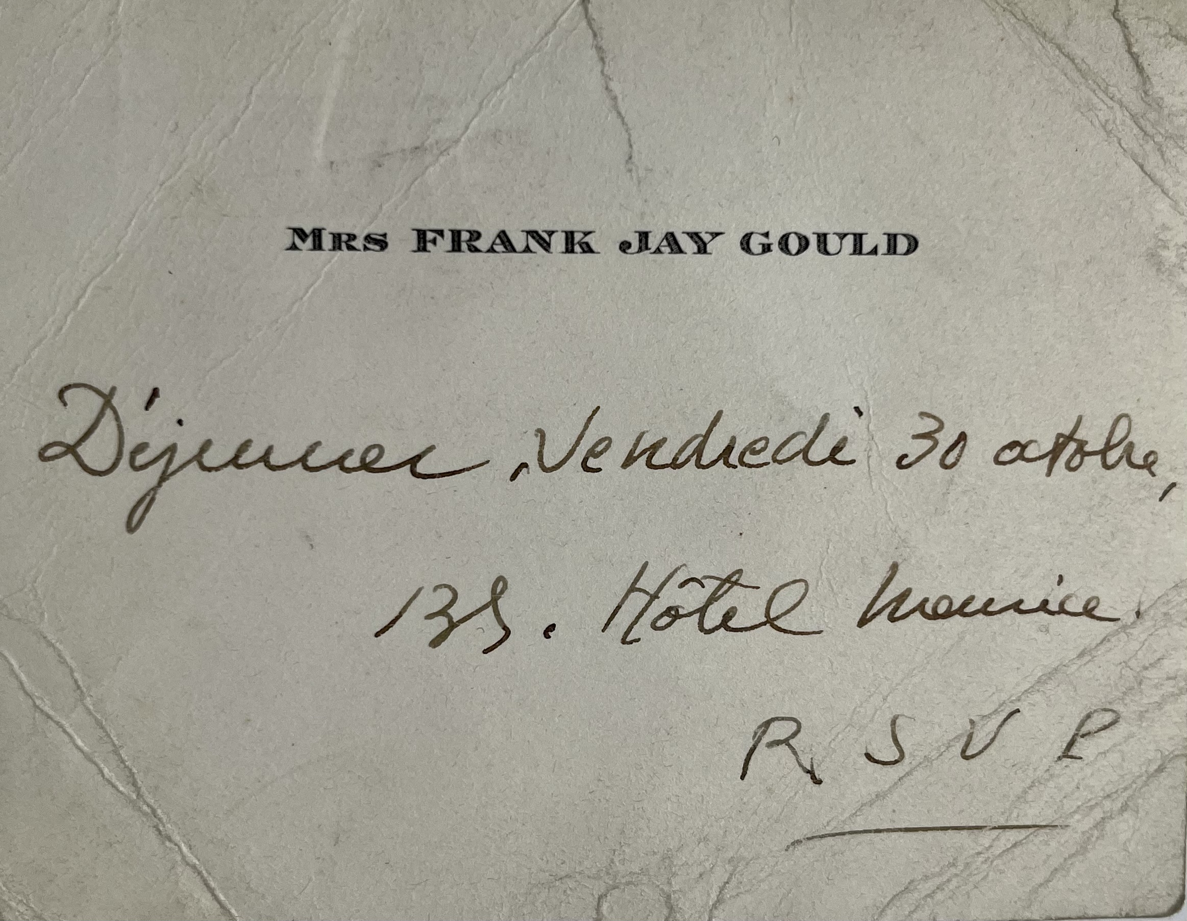 Quelques mots d'invitation [à son ami André Fraigneau] à "Déjeuner, vendredi 30 octobre 13h. Hôtel Meurice. R SVP", tracés sur sa carte de visite "Mrs Frank Jay Gould". [Florence Gould tint durant plusieurs années, à l'hôtel Meurice, un salon fréquenté par les milieux littéraires et artistiques].