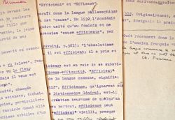 Tapuscrit d'un article intitulé : "Le français vivant - Du participe passé", amusante leçon de grammaire et de linguistique : "La jeune fille que j'ai vu peindre". Surgit devant les yeux du grammairien une jouvencelle barbouillant de couleurs diverses une toile qui n'en peut mais. "La jeune fille que j'ai vue peindre" : candide et quelque peu empruntée, la jeune fille offre la fraîcheur de son teint et la pureté de ses lignes au pinceau de l'artiste. Je grammatiste qui a trouvé cette règle pouvait en concevoir un juste orgueil [...]".