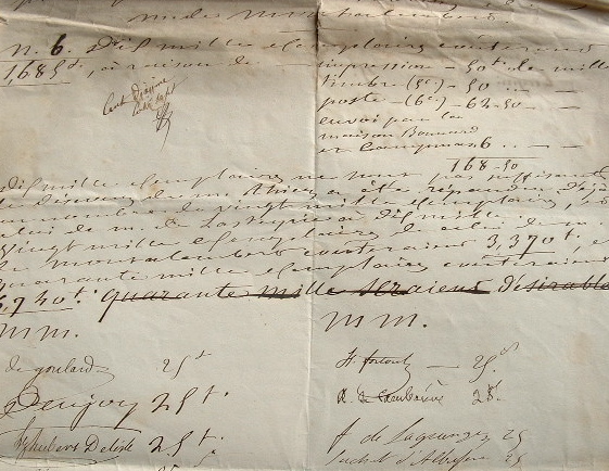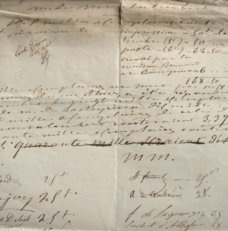 "Liste des souscripteurs pour publier le discours de M. de Montalembert". Suivent 31 signatures de ministres et personnalités politiques avec, en regard, le montant de leur don : Ach. Fould, Boulard, Etchevery, Aug. Hennesen, Cuverville, Hipp. Fourtoul, Cambacérès, F. de Lagrange, Suchet d'Albufera, Siméon, Ségur d'Aguesseau, Mérode, Camille Godelle, etc. En haut figure le détail des dépenses pour un tirage à 10.000 exemplaires. Une note précise : "Dix mille exemplaires ne sont pas suffisants ; le discours de M. Thiers a été répandu déjà au nombre de vingt mille exemplaires, et celui de M. de Lasteyrie à dix mille [...]".