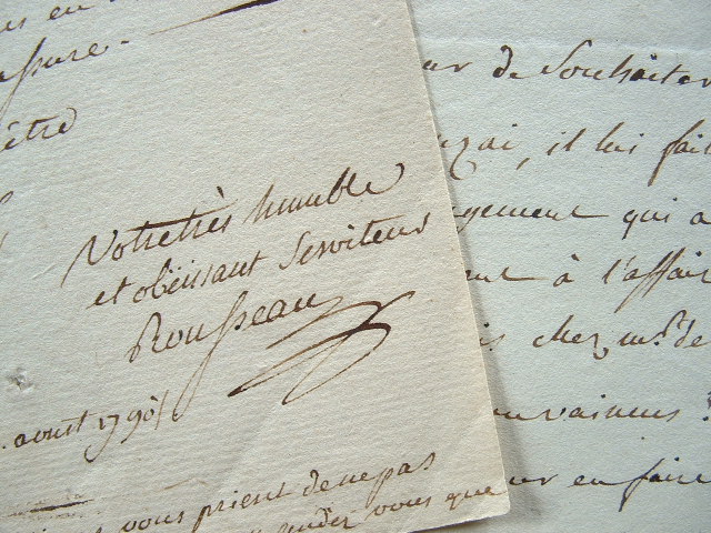 J. Rousseau (Soissons, 1761/1800)Deux lettres écrites le même jour par le haute-contre de l'opéra J. Rousseau. Il demande à son correspondant s'il a eu connaissance du résultat de son jugement. «Sommes-nous vainqueurs ou vaincus ? J'attends votre réponse pour en faire part à mes associés». Peu après, il adresse une seconde missive. «Nous avons ce soir une répétition au magasin de l'opéra, rue St Nicaise ; elle ne sera finie qu'à neuf heures ; si vous voulez avoir la bonté de venir nous y trouver, nous serons tous réunis. Il paraît que notre affaire se brouille. Encore une fois, tachez de nous tranquiliser, nous en avons bien besoin, je vous assure [...]».