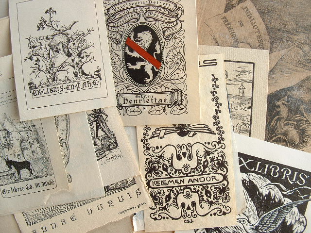 Ensemble de 35 ex-libris différents, principalement du XXe, français et étrangers : bibliothèque de Frémigny, 3 épreuves de bois gravés, Ed. Mahé (3 différents), Henri Miot, Henriettae, Kelemen Andor, J.-J. Wintzer, Bartholomei Garres, Ruggero Cani, Maria Teresa Tadeu, Eles Geza, Maximilian Rothballer, Samuel X. Radbil, etc.