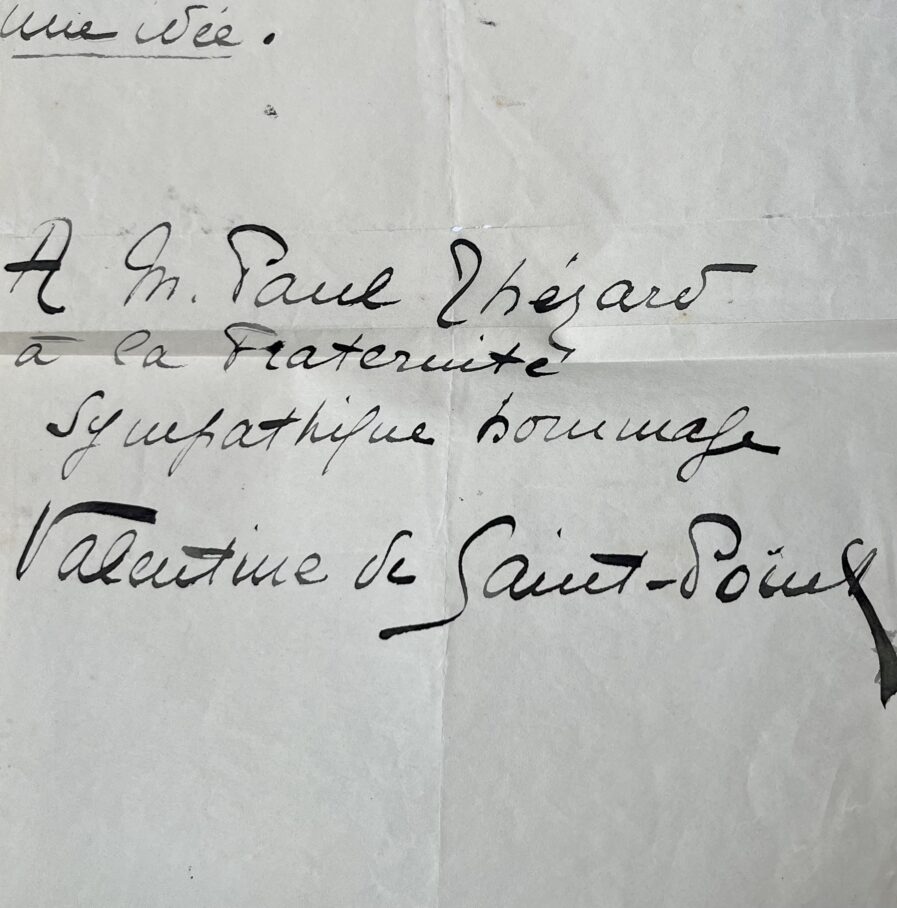 Suivi de l'envoi "A M. Paul Thérard à la fraternité sympathique hommage Valentine de Saint-Point". Grande et belle signature.