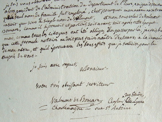 Jacques Christophe Valmont de Bomare (Rouen, 1731/1807)Valmont de Bomare se remet doucement d'une convalescence pénible et ne peut, de ce fait, venir en personne remercier son correspondant, pour l'action qu'il a menée en faveur de son neveu. «Je dois observer, monsieur, que sous les règnes de la Terreur, M. Lindet, alors président de l'administration du département de l'Eure, exigeoit strictement que le seul nom de famille fut employé, c'est pourquoi mon neveu ne se trouve inscrit que sous le simple nom de Valmont, et non sous celui de Valmont de Bomare, comme il le prenoit et portoit, soit avant, soit après, cette époque. Mais comme tous les citoyens ont été obligés d'en passer par là, je crois bien que cette formule notoire ne doit pas faire naître d'entrave à la demande de mon neveu [...]». Une mention, en haut précise : "Le proposer pour une place de garde à cheval".