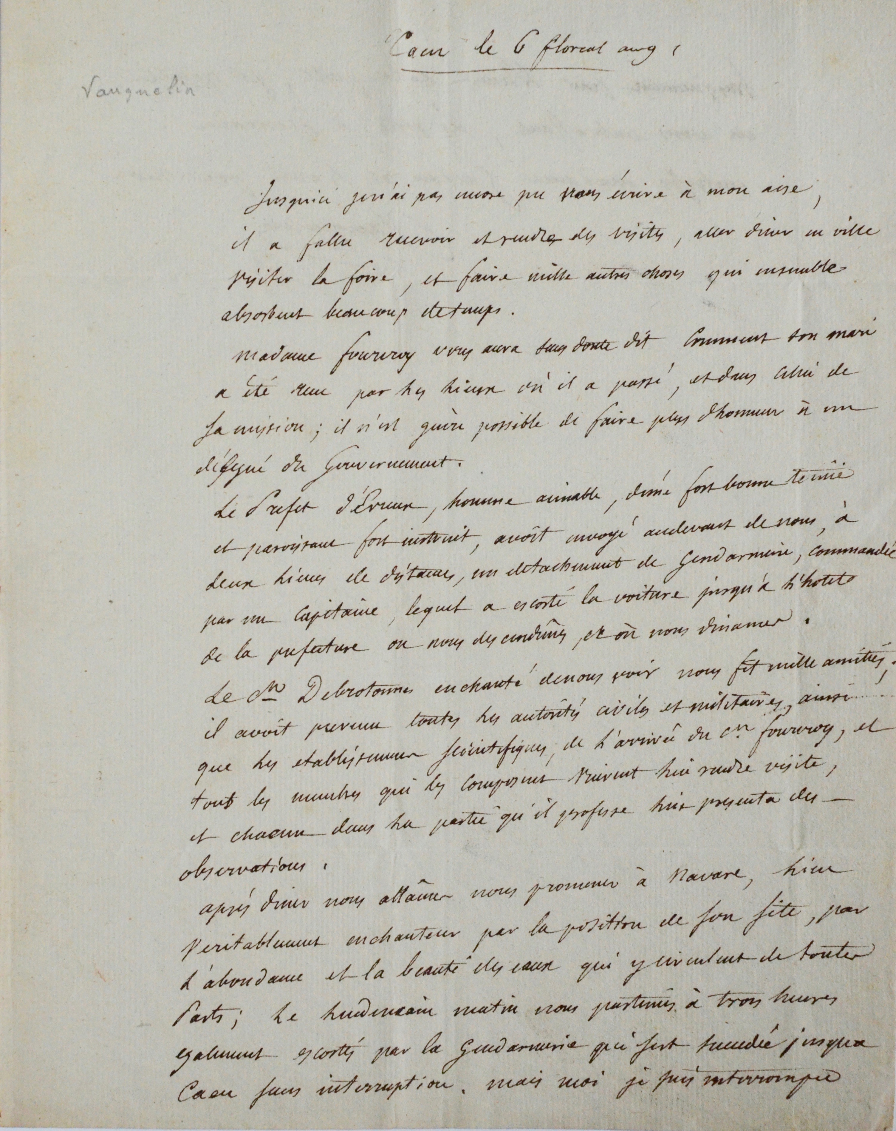 "Madame Fourcroy vous aura sans doute dit comment son mari a été reçu par les lieux où il a passé, et dans celui de sa mission; il n'est guère possible de faire plus d'honneur à un délégué du gouvernement. Le préfet d'Evreux, homme aimable, d'une fort bonne tenue et paraissant fort instruit, avait envoyé au devant de nous, à deux lieues de distance, un détachement de gendarmerie, commandé par un capitaine, lequel a escorté la voiture jusqu'à l'hôtel de la préfecture où nous descendîmes et où nous dînâmes. Le Cn Debrotonnes enchanté de nous voir, nous fit mille amitiés ; il avait prévenu toutes les autorités civiles et militaires, ainsi que les établissements scientifiques, de l'arrivée du Cn Fourcroy, et tous les membres qui les composent vinrent lui rendre visite, et chacun dans la partie qu'il professe lui présenta des observations. Après dîner nous allâmes nous promener à Navare, lieu véritablement enchanteur par la position de son site, par l'abondance et la beauté des eaux qui y circulent de toutes parts [...]"