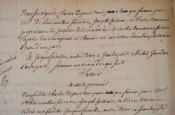 Convention de vente du septième de la Manufacture Royale de Maroquins et Chamois établie rue Saint-Hippolyte, à Paris. Le document, rédigé en huit articles, est signé par les 6 vendeurs et les 4 acheteurs. D'intéressants détails sur les prix des peaux suivant leur qualité (boucs, chèvres, veaux, daims, moutons). «Leur cédons pareillement l'écurie, étuvé, pavé, charpente et autres améliorations d'icelles sans aucune réserve moyennant quatorze cent trente et une livres. Les ustencils sur le pied de l'achapt sans aucune augmentation pour raison des améliorations. Les drogues sur le pied quelles reviennent rendues à la manufacture suivant la vérification qui en sera faitte. Les peaux de maroquins faites et à faire à raison de quarante deux livres la douzaine. Les peaux de boucs en chamois à raison de soixante livres la douzaine [...]. Les maroquins qui sont actuellement en Flandres seront rendus à Lille et pris dans ladite ville sur le pied de quarante deux livres la douzaine à la même condition d'être loyalles et marchandes, sinon sur le pied de l'estimation [...]».