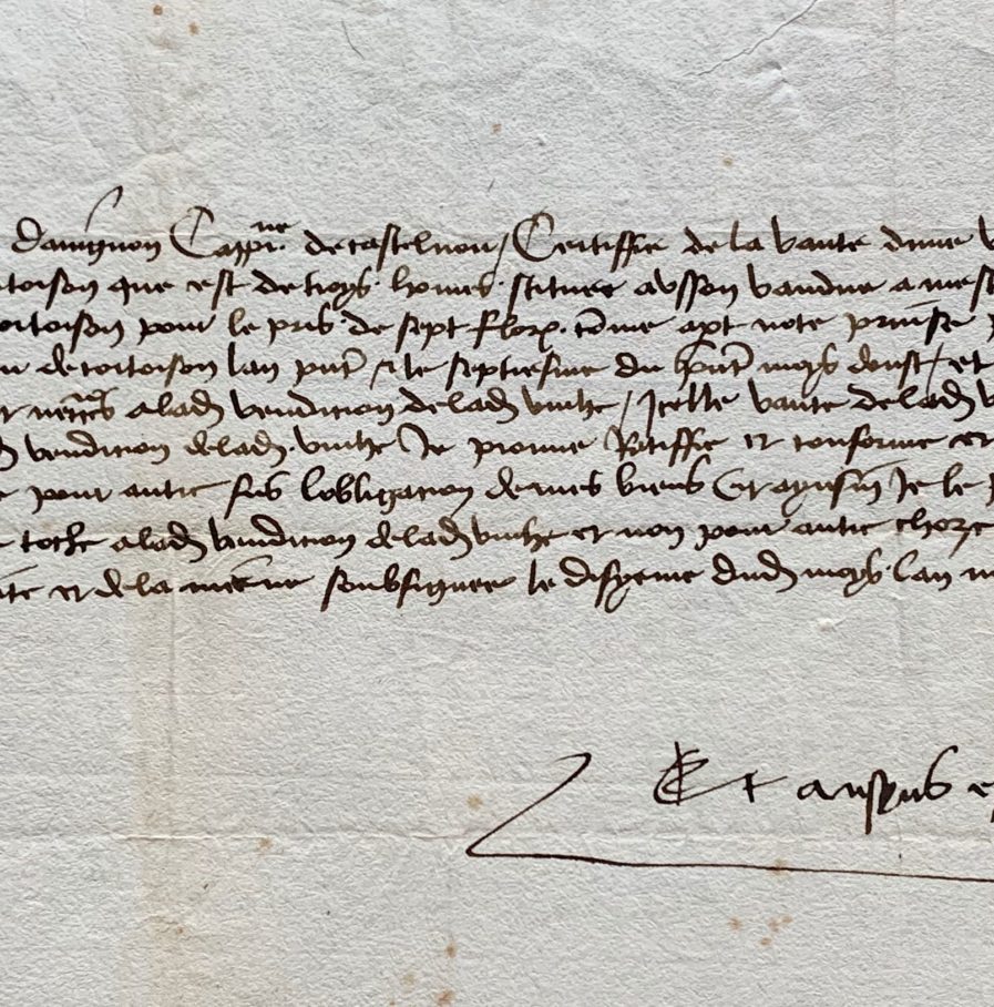 Vente d'une vigne à Husson [Château Husson appellation Châteauneuf-du-Pape, à Courthézon]. Document signé par Jehan Nicolas d'Avignon, capitaine de Castelnau [Châteauneuf].