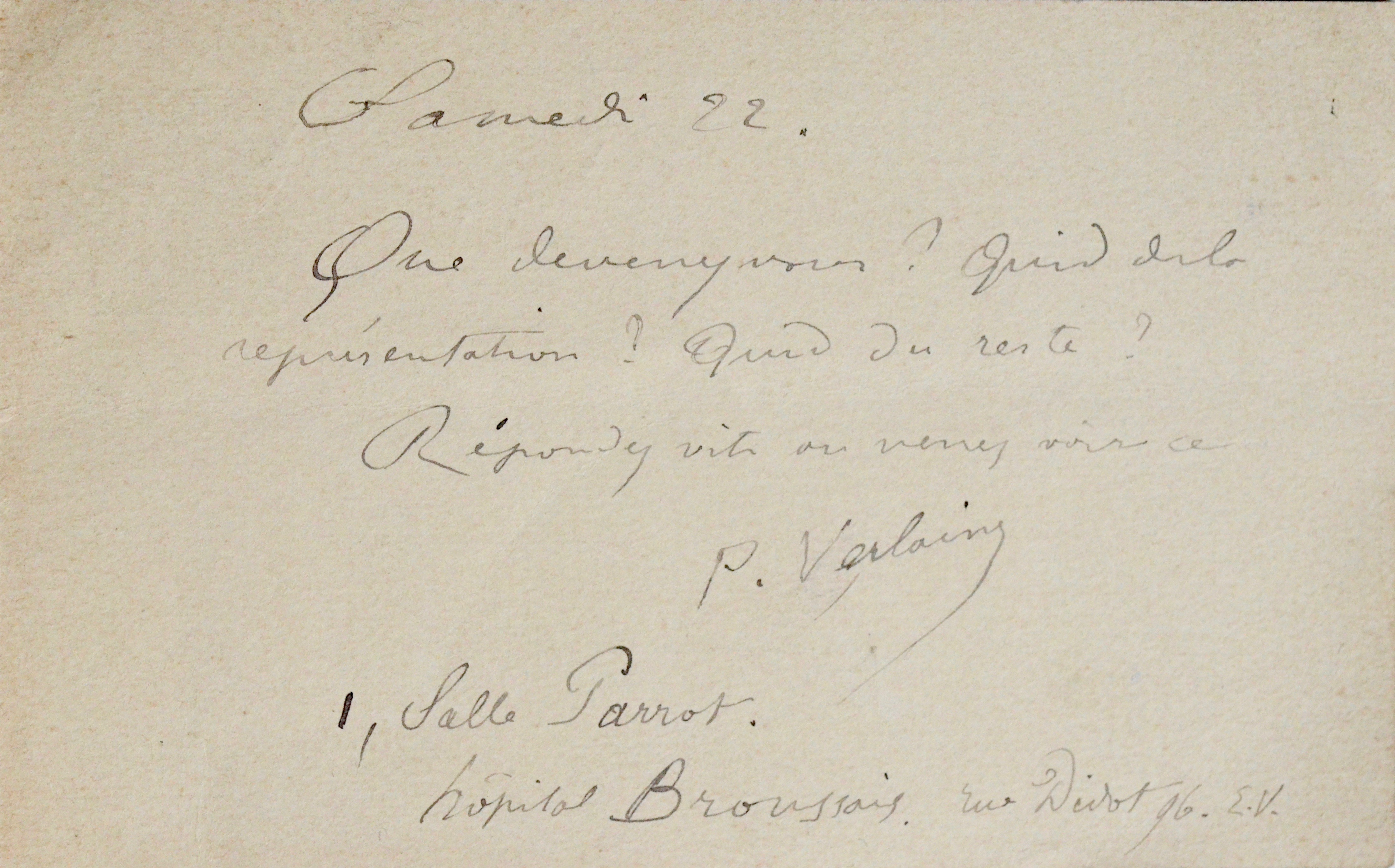 "Que devenez vous ? Quid de la représentation ? Quid du reste ? Répondez vite ou venez voir ce Paul Verlaine 1, salle Parrot hôpital Broussais, rue Didot 96 E.V.".