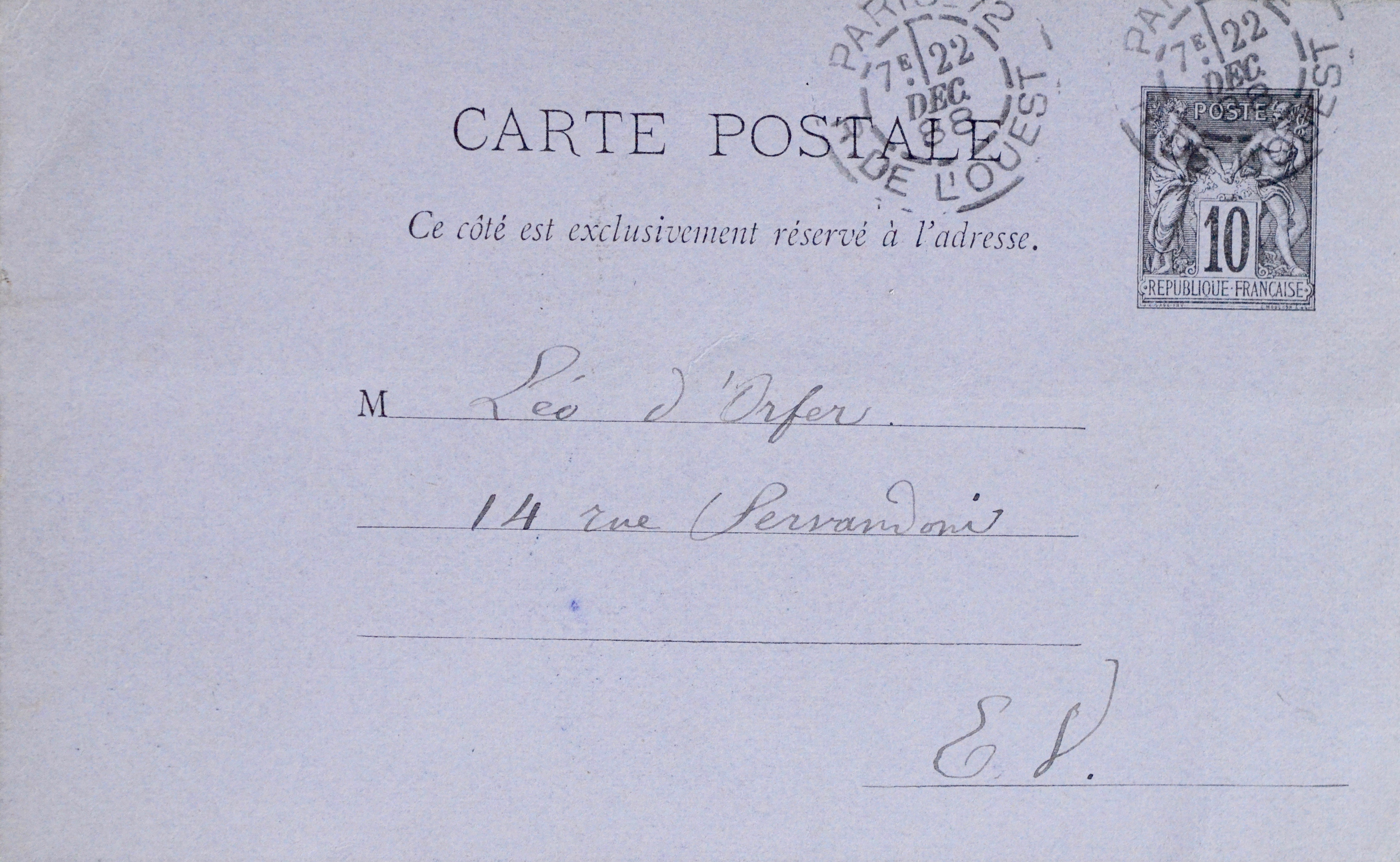 Paul Verlaine (Metz, 1844/1896)Charmante carte de Paul Verlaine, alors hospitalisé à l'hôpital Broussais, adressée à son ami le poète symboliste et éditeur Léo d'Orfer :