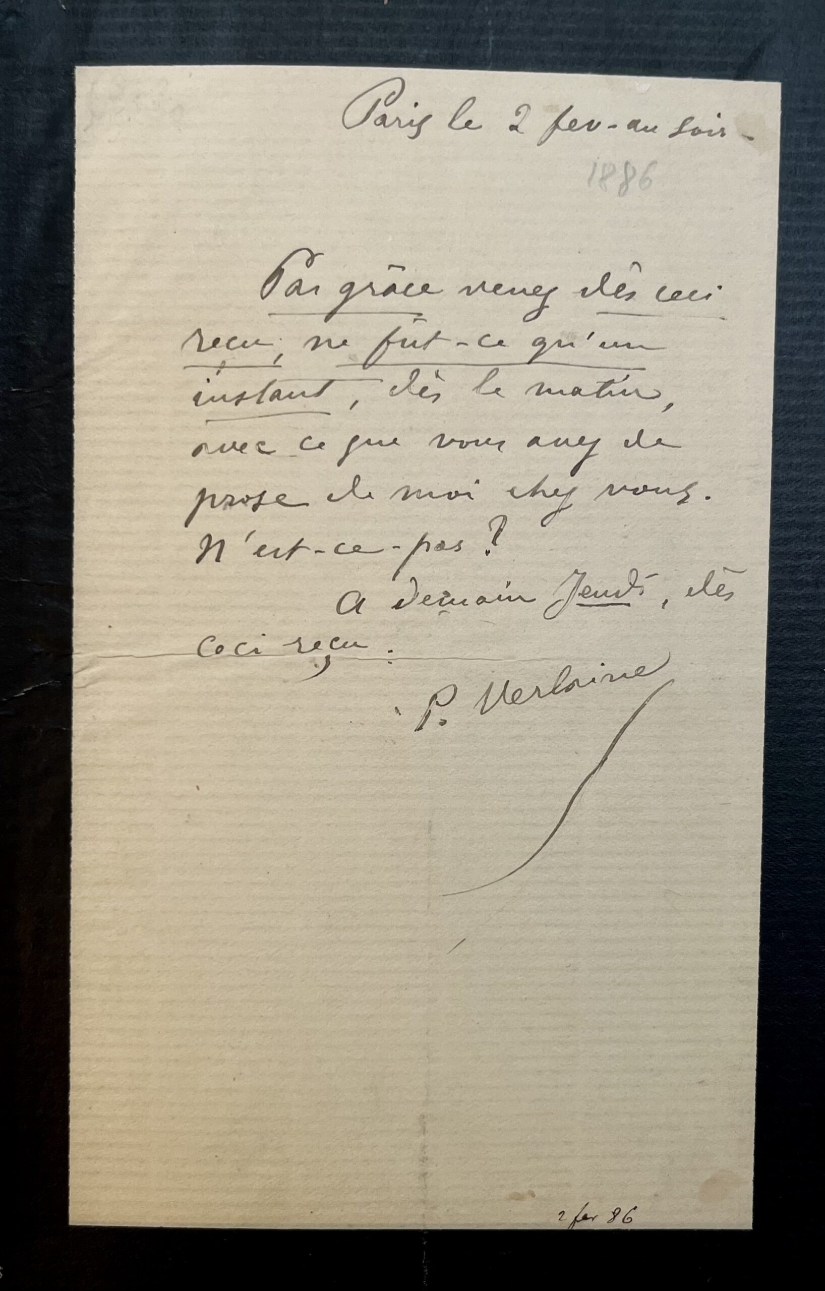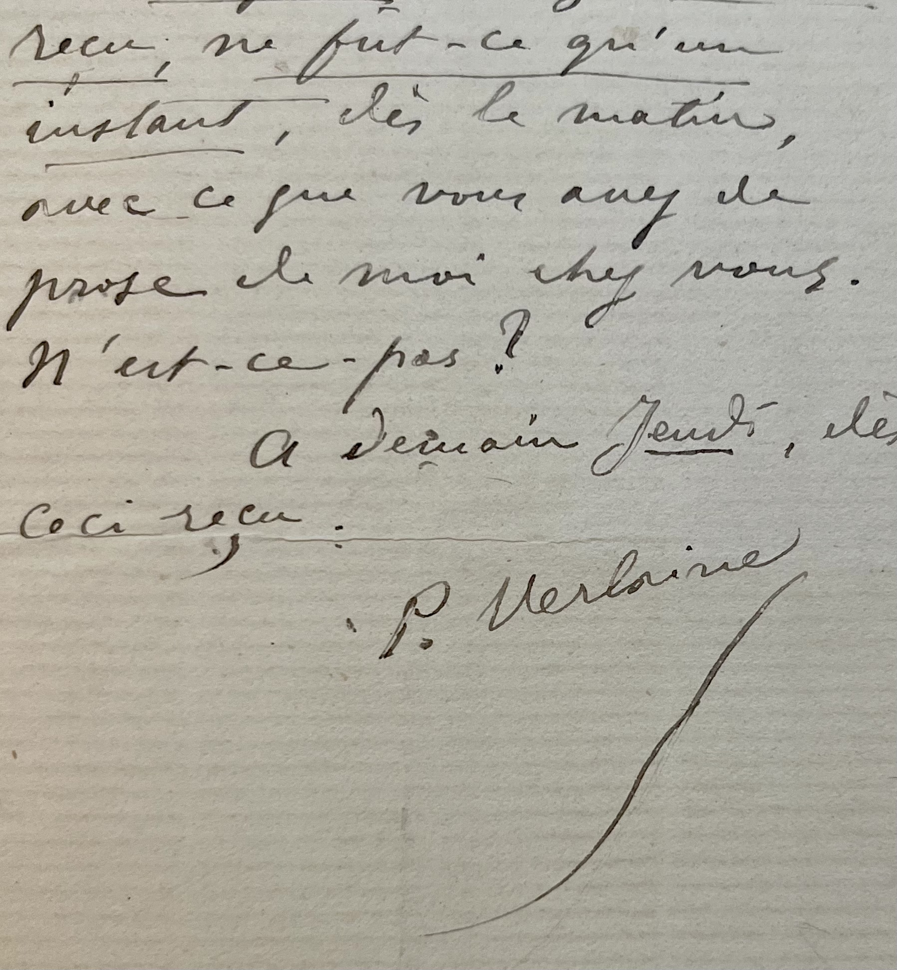 « Par grâce venez dès ceci reçu, ne fût-ce qu’un instant, dès le matin, avec ce que vous avez de prose de moi chez vous. N’est-ce pas. A demain jeudi, dès ceci reçu. P. Verlaine ».
