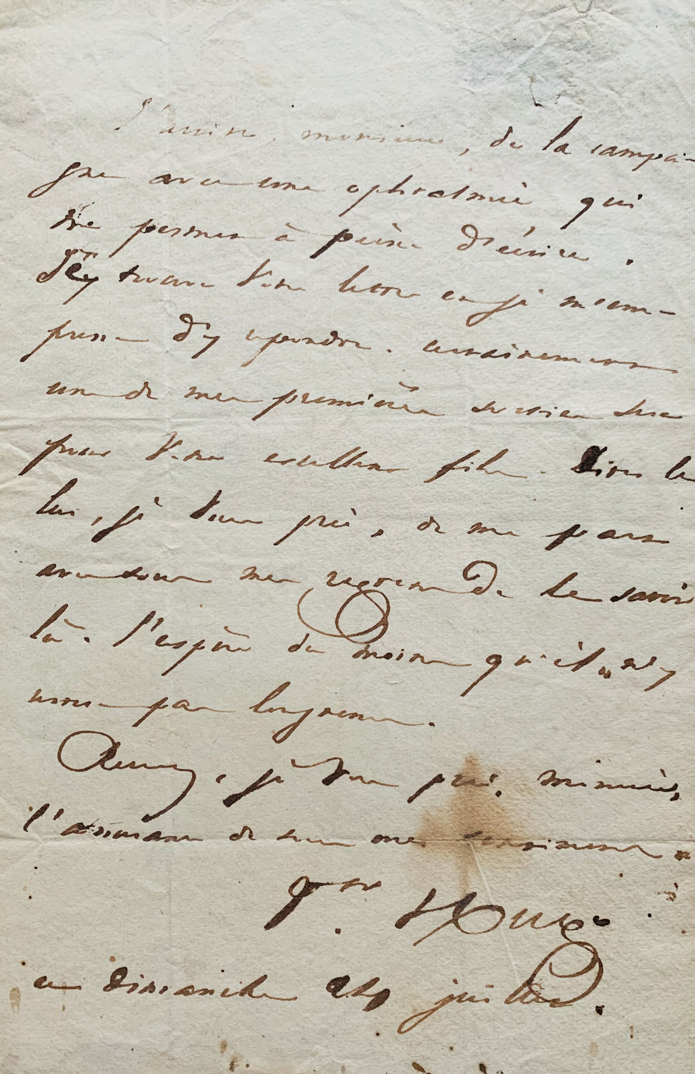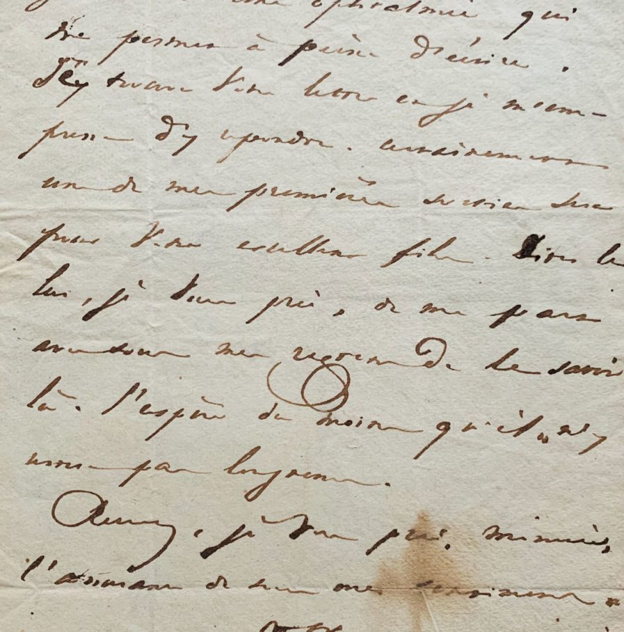 "J'arrive, monsieur, de la campagne avec une ophtalmie qui me permet à peine d'écrire. Je trouve votre lettre et je m'empresse d'y répondre. Certainement une de mes premières sorties sera pour votre excellent fils. Dites le lui, je vous prie, de ma part avec tous mes regrets de le savoir là. J'espère du moins qu'il n'y restera pas longtemps.