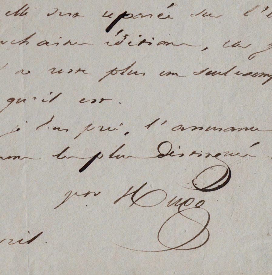 Victor Hugo (Besançon, 1802/1885)Belle lettre de Victor Hugo écrite au moment où paraît Notre-Dame de Paris (mars 1831, chez Gosselin). Il n'a pas oublié la promesse faite à son camarade, d'inscrire son nom sur la liste des expéditions de son dernier roman [Notre-Dame de Paris].