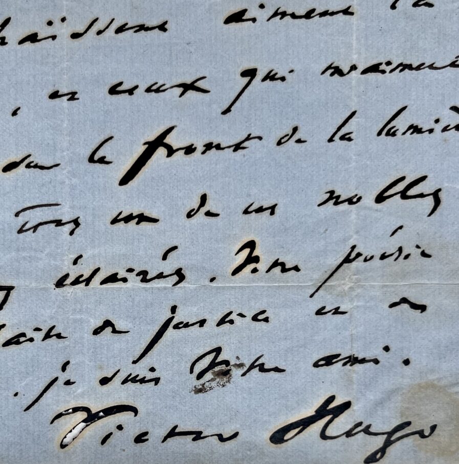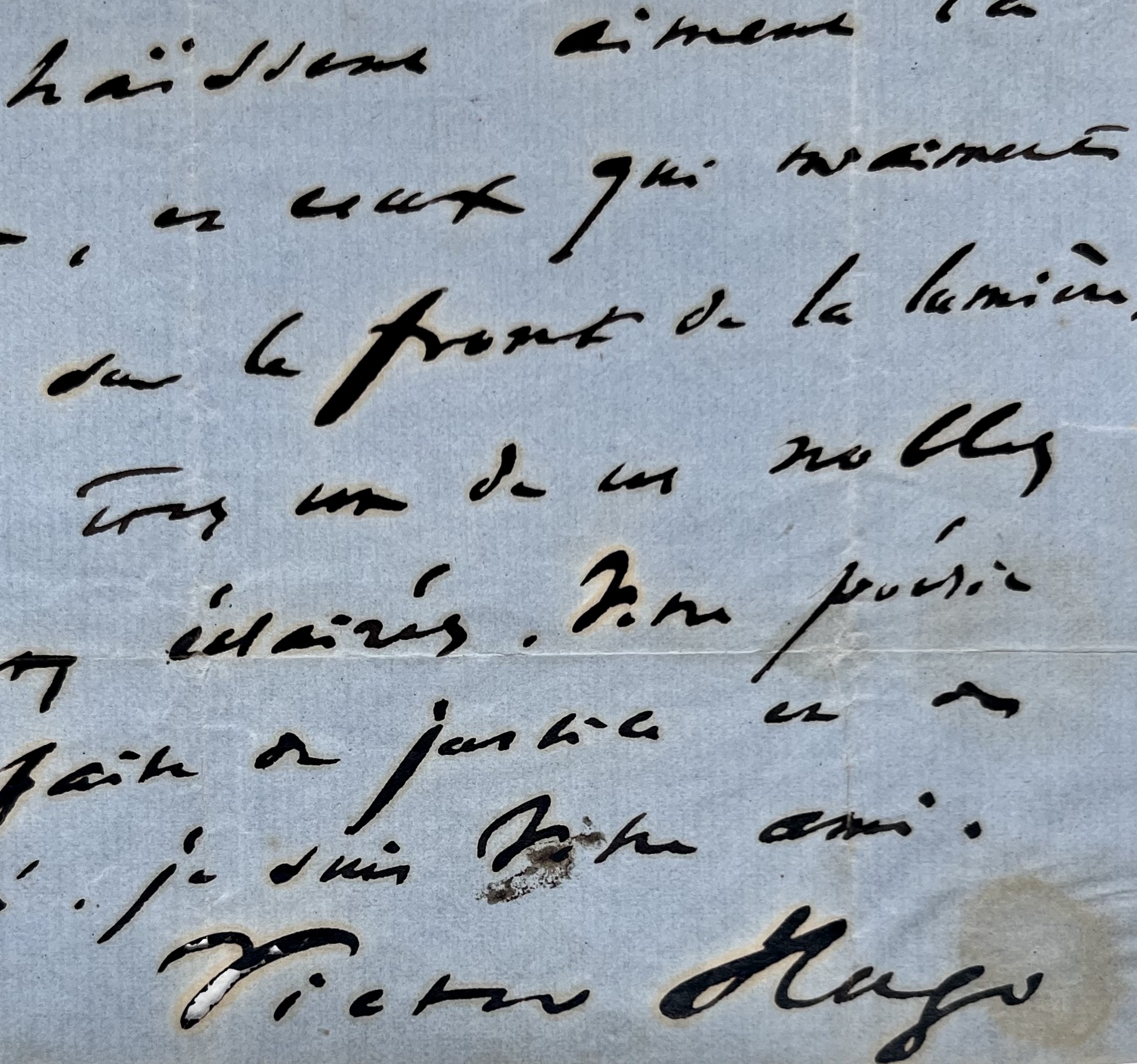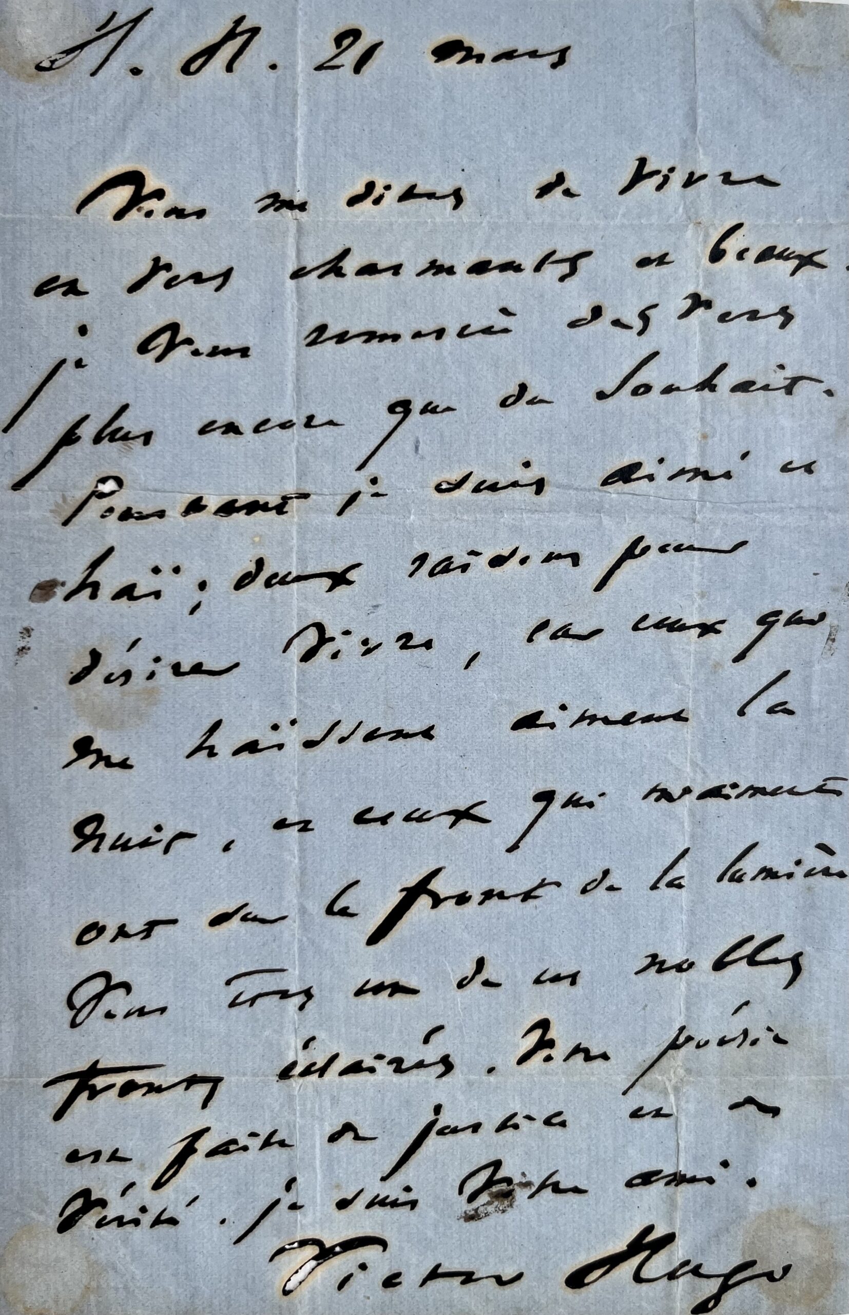 "Vous me dites de vivre en vers charmants et beaux. Je vous remercie des vers encore plus que du souhait. Pourtant je suis aimé et haï ; deux raisons pour désirer vivre, car ceux qui me haïssent aiment la nuit, et ceux qui m'aiment ont sur le front de la lumière. Vous êtes un de ces nobles fronts éclairés. Votre poésie est faite de justice et de vérité. Je suis votre ami. Victor Hugo »
