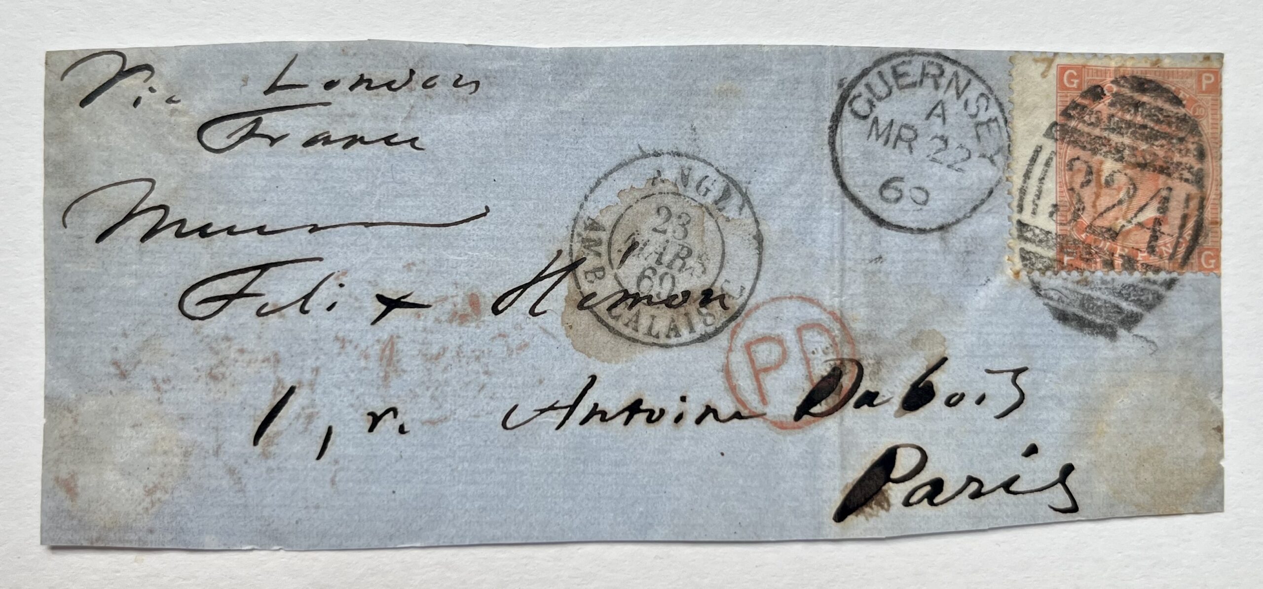 Recto de l'enveloppe conservé avec adresse autographe : « Via London / France / Monsieur / Félix Hémon / 11, r. Antoine Dubois / Paris », avec timbre et cachets postaux : "Guernesey 22 mars 1869" et "Calais 23 mars 1869". Papier bleu.