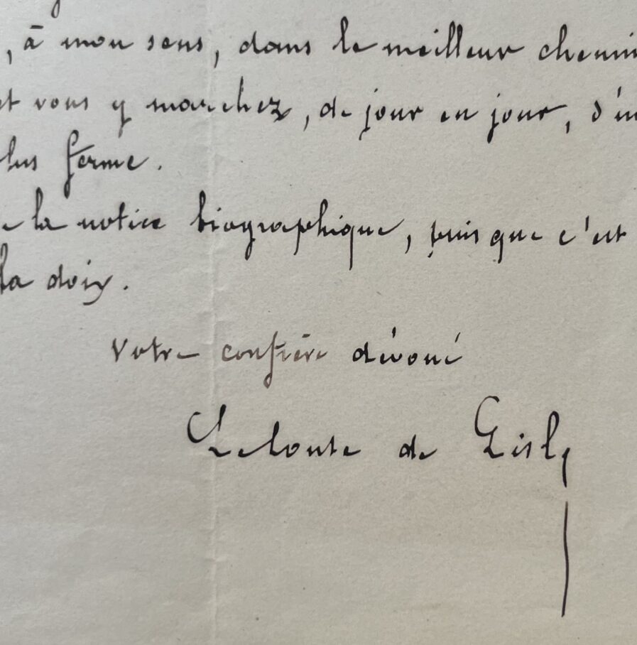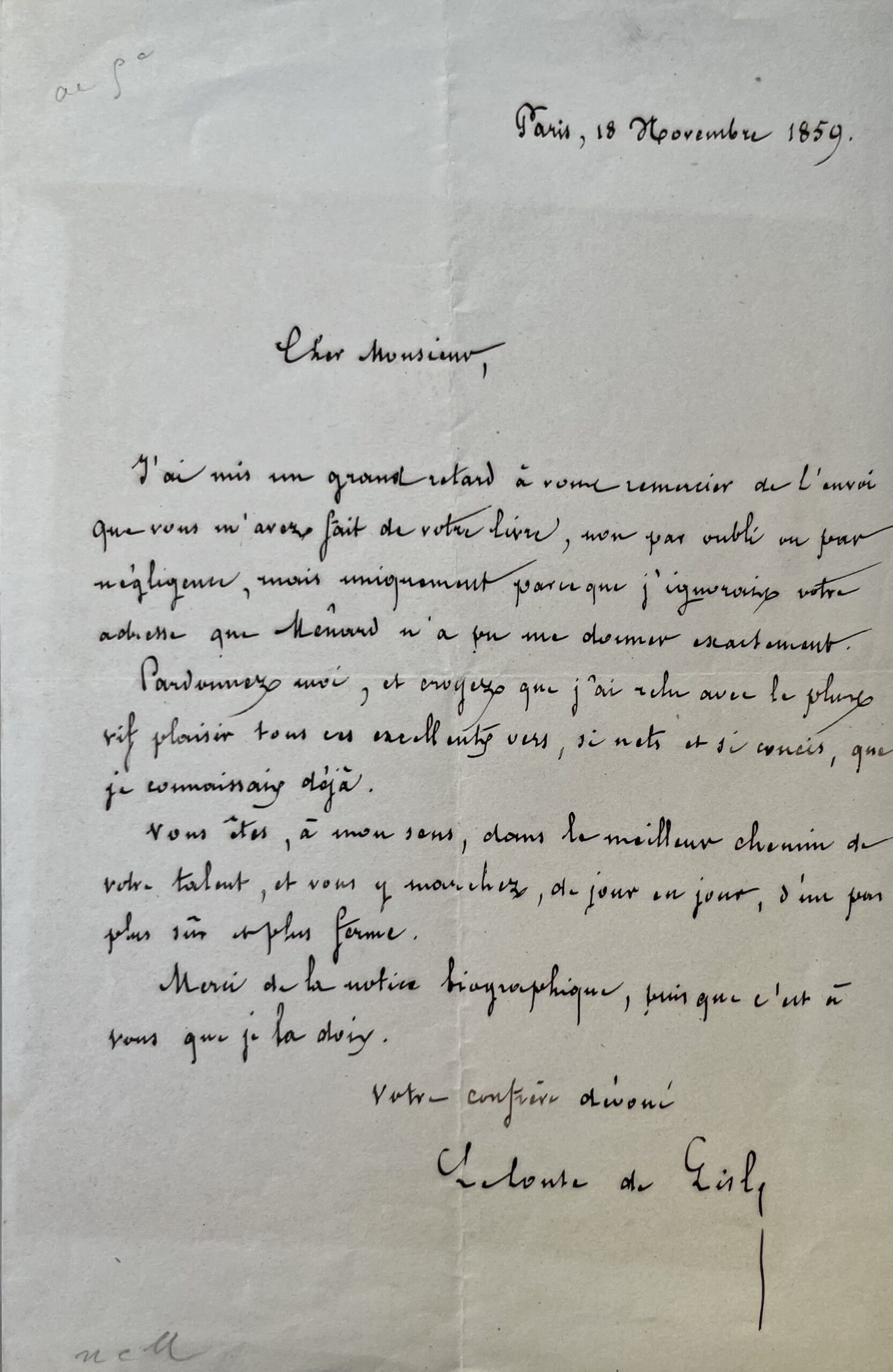 "J’ai mis un grand retard à vous remercier de l’envoi que vous m’avez fait de votre livre, non par oubli ou par négligence, mais uniquement parce que j’ignorais votre adresse que Ménard n’a pu me donner exactement. Pardonnez-moi, et croyez que j’ai relu avec le plus vif plaisir tous ces excellents vers, si nets et si concis, que je connaissais déjà. Vous êtes, à mon sens, dans le meilleur chemin de votre talent, et vous y marchez, de jour en jour, d’un pas plus sûr et plus ferme. Merci de la notice biographique, puisque c’est à vous que je la dois. Votre confrère dévoué Leconte de Lisle".