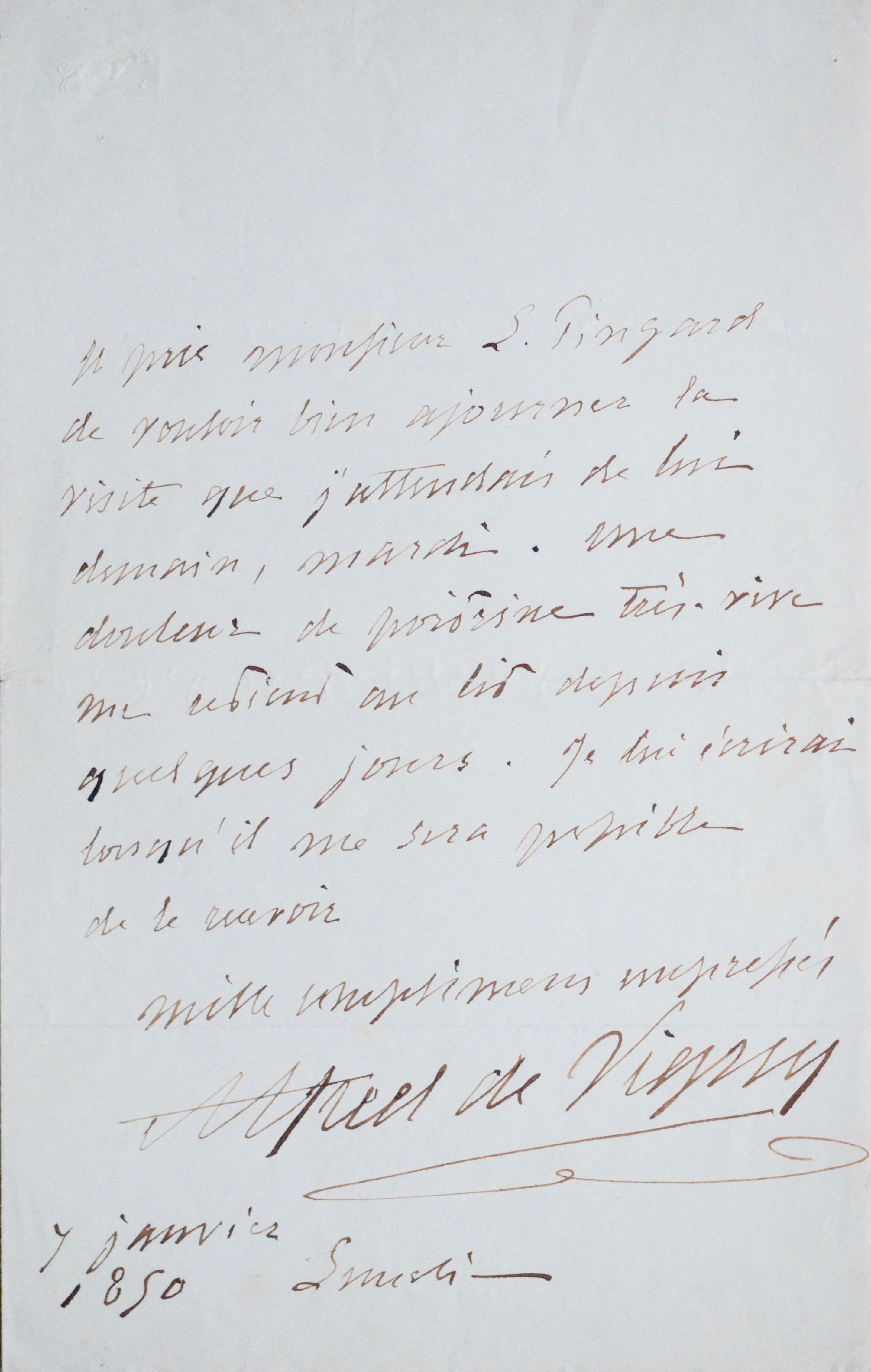 Lettre d'Alfred de Vigny, souffrant, adressée au secrétaire de l'Institut.