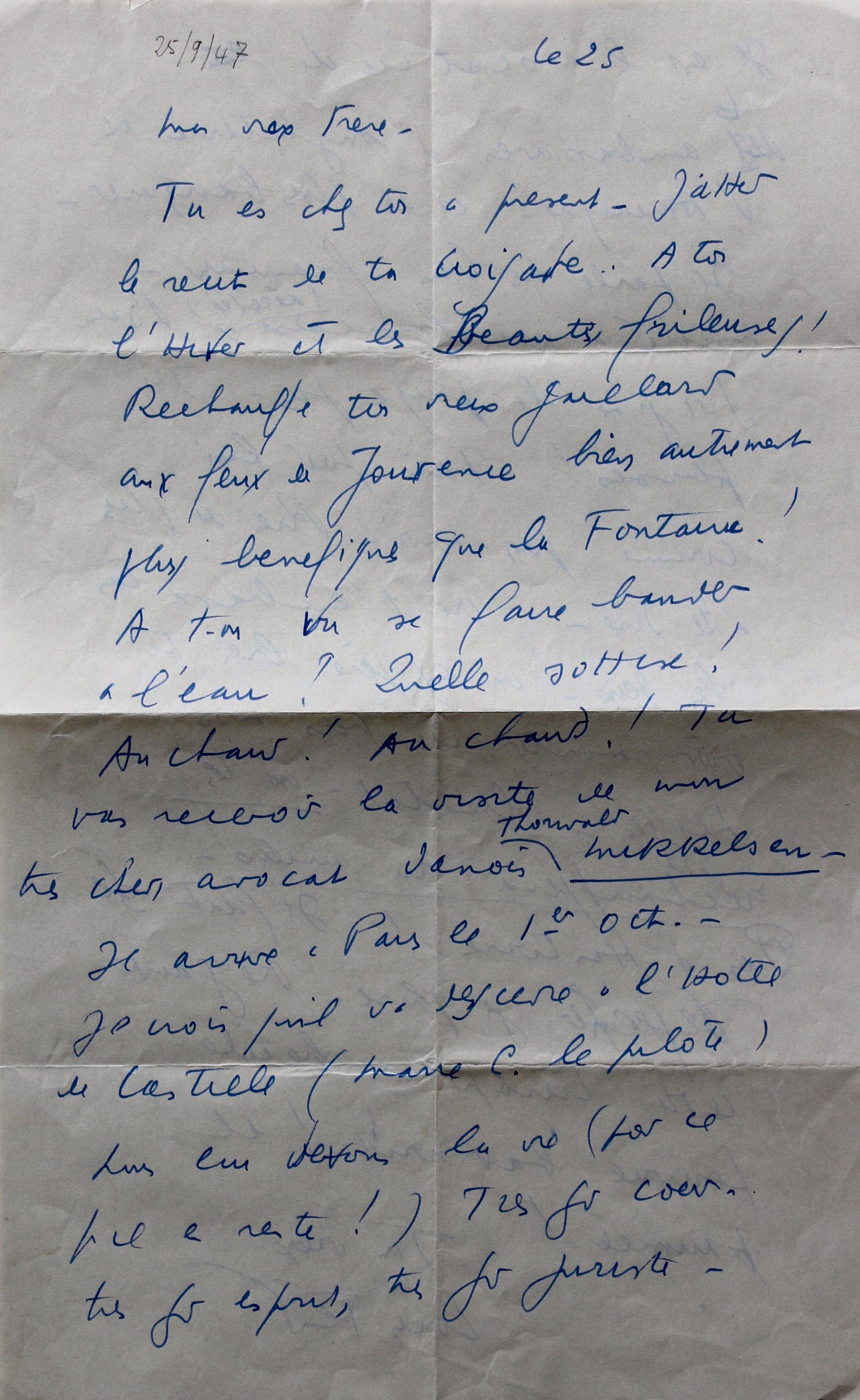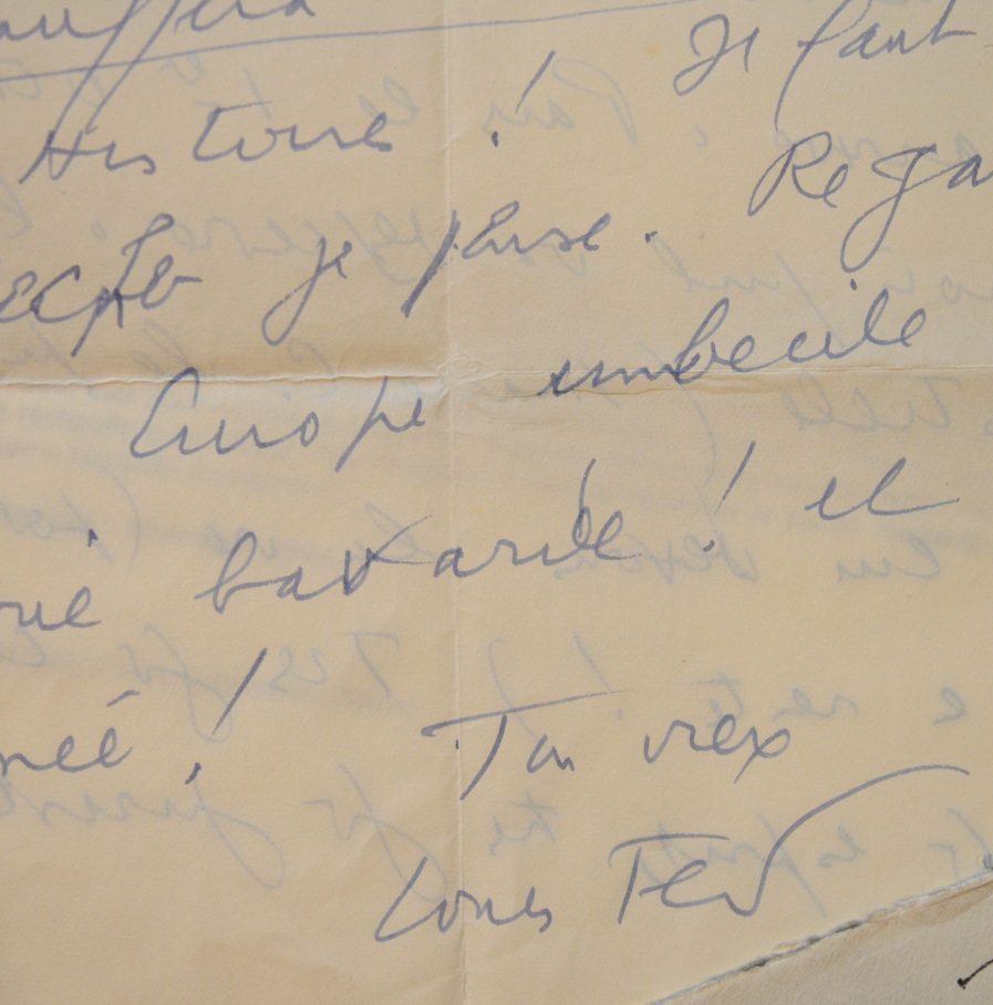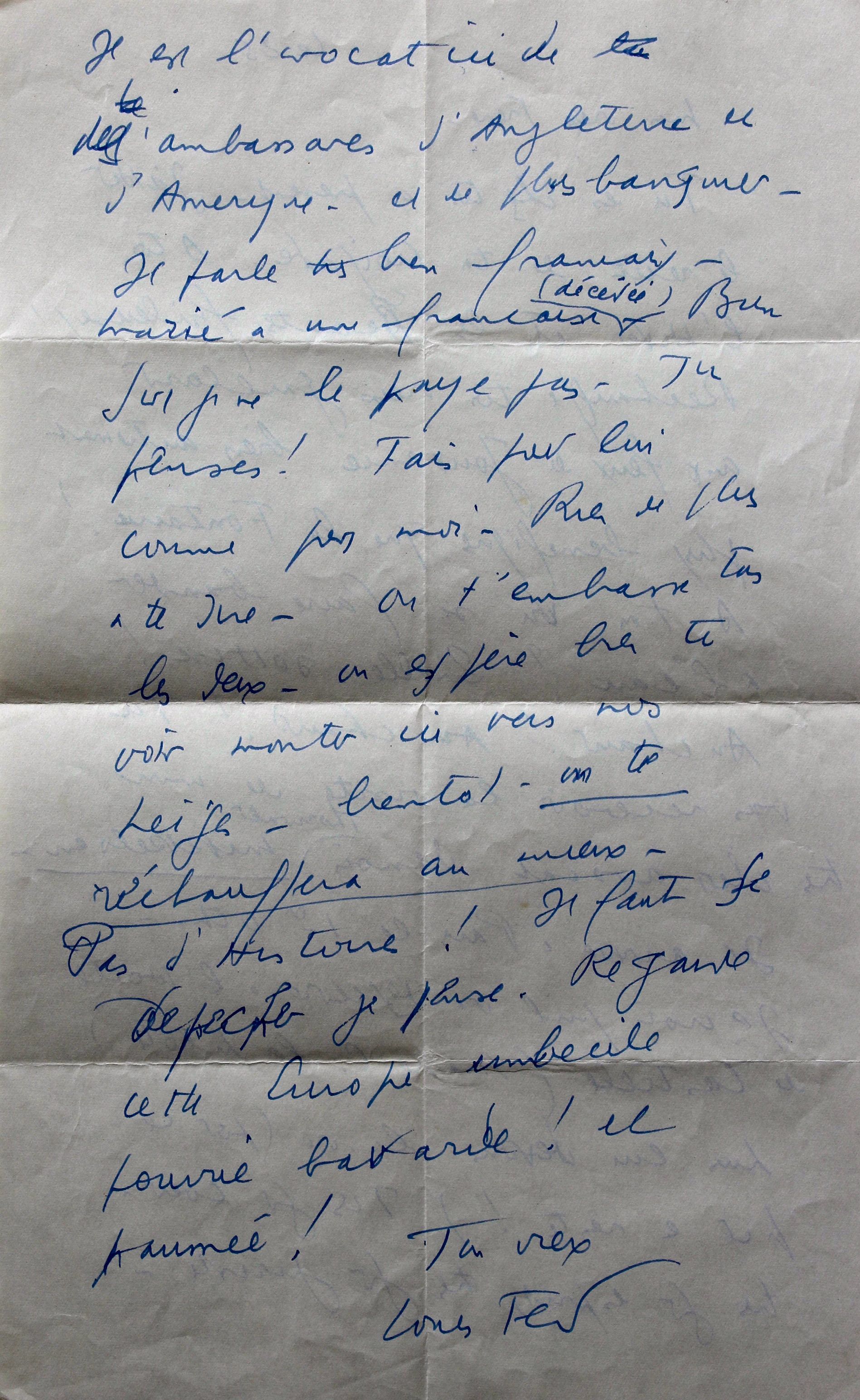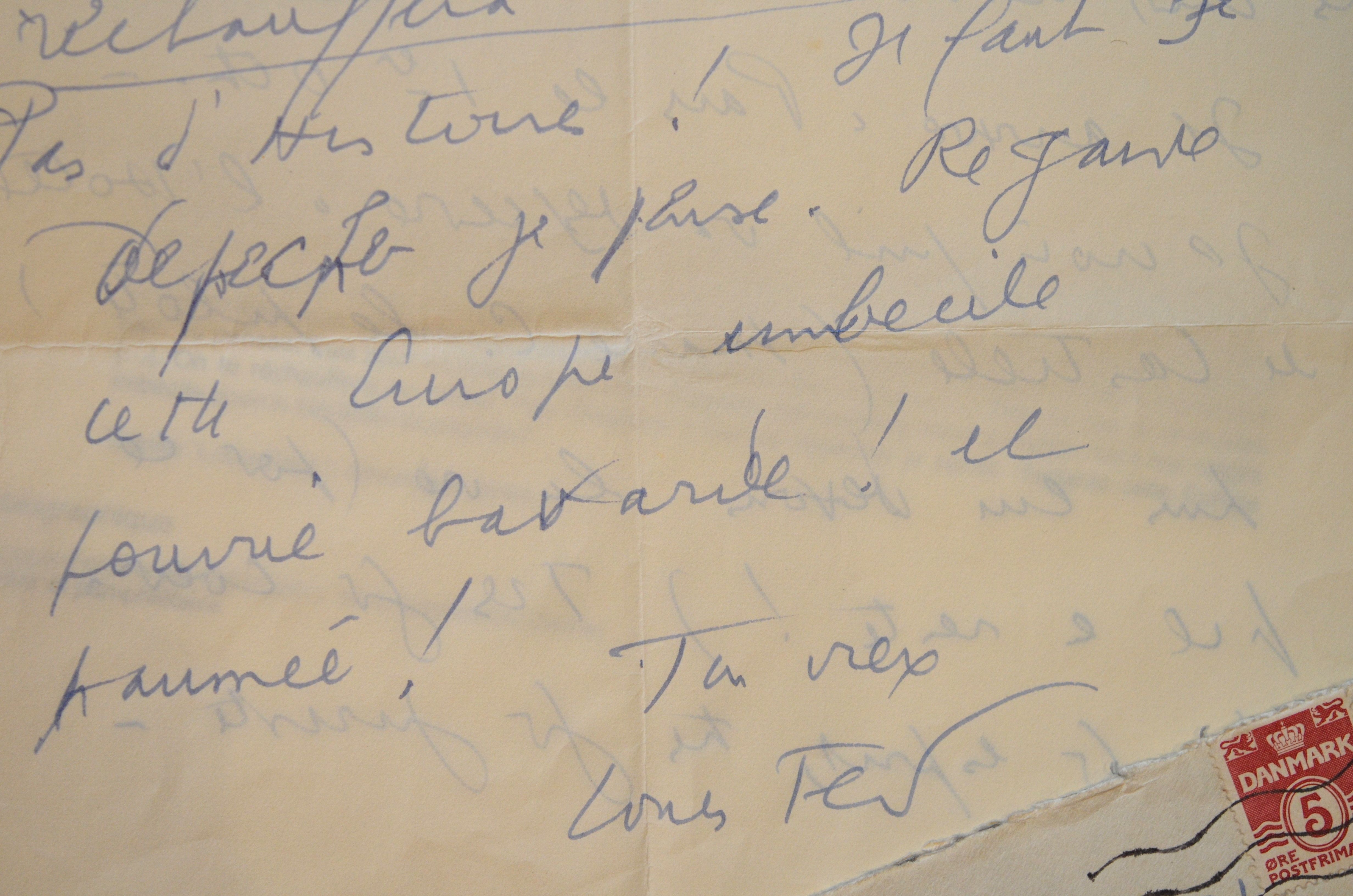 Louis-Ferdinand Céline (Courbevoie, 1894/1961)Belle lettre de Céline louant l'action de son avocat Mikkelsen et fustigeant l'Europe. "J'attends le récit de ta croisade. A toi l'Hiver et les Beautés frileuses! Réchauffe-toi vieux gaillard aux feux de Jouvence bien autrement plus bénéfiques que la Fontaine! A-t-on vu se faire bander à l'eau? Quelle sottise! Au chaud! Au chaud!". Il annonce la venue à Paris de son "très cher" avocat danois, Thorwald Mikkelsen. "Nous lui devons la vie (pour ce qu'il en reste!). Très grand coeur, très grand esprit, très grand juriste. Il est l'avocat ici des ambassades d'Angleterre et d'Amérique. Il parle très bien français [...]. Bien sûr que le ne le paye pas. Tu penses! Fais pour lui comme pour moi". Il espère que Geoffroy viendra bientôt "vers nos neiges [...]. On te réchauffera au mieux. Pas d'histoire! Il faut se dépêcher je pense. Regarde cette Europe imbécile pourrie bavarde! et paumée!".