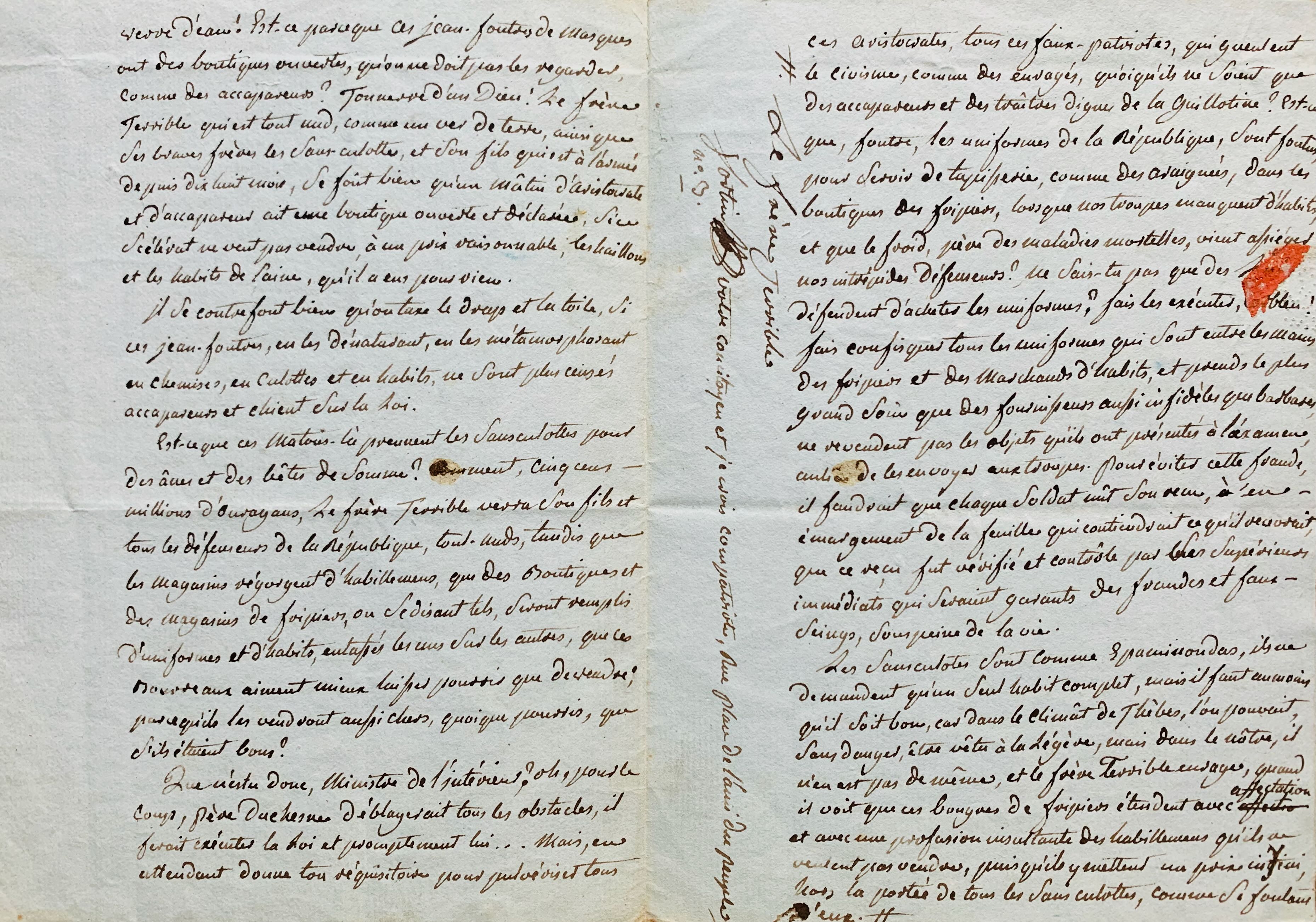 Violente lettre de ce sans-culotte et ancien procureur au Parlement, Fortin, qui se fait appeler le "Frère terrible". Il enrage contre les fripiers qui s'enrichissent sur le dos du peuple.