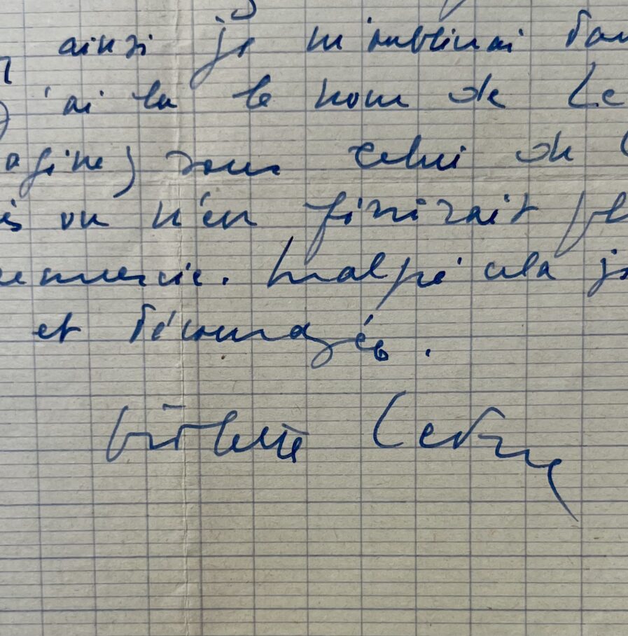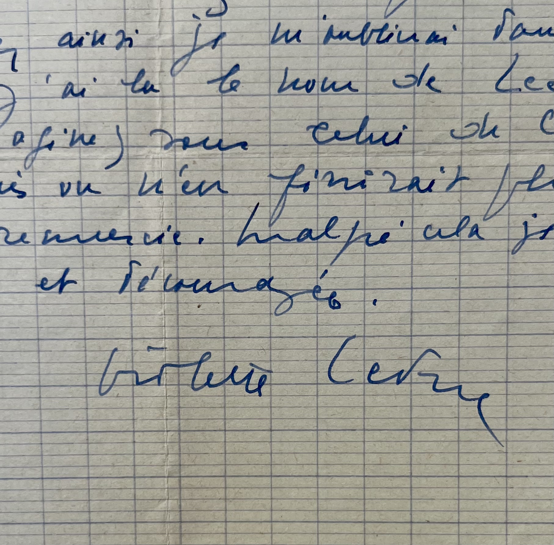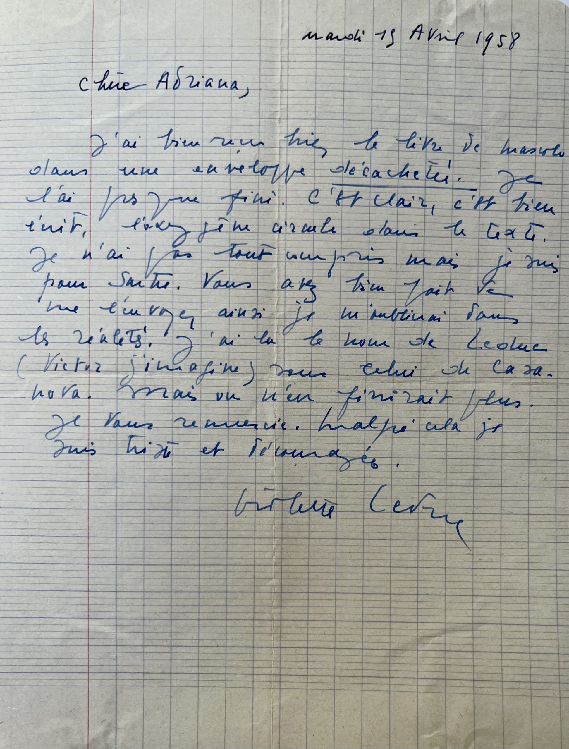 "Chère Adriana, j’ai bien reçu hier le livre de Mascolo dans une enveloppe décachetée. Je l’ai presque fini. C’est clair, c’est bien écrit, l’oxygène circule dans le texte. Je n’ai pas tout compris mais je suis pour Sartre. Vous avez bien fait de me l’envoyer ainsi je m’oublierai dans les réalités ! J’ai lu le nom de Leduc (Victor j’imagine) sous celui de Casanova. Mais on n'en finirait plus. Je vous remercie. Malgré cela je suis triste et découragée. Violette Leduc"