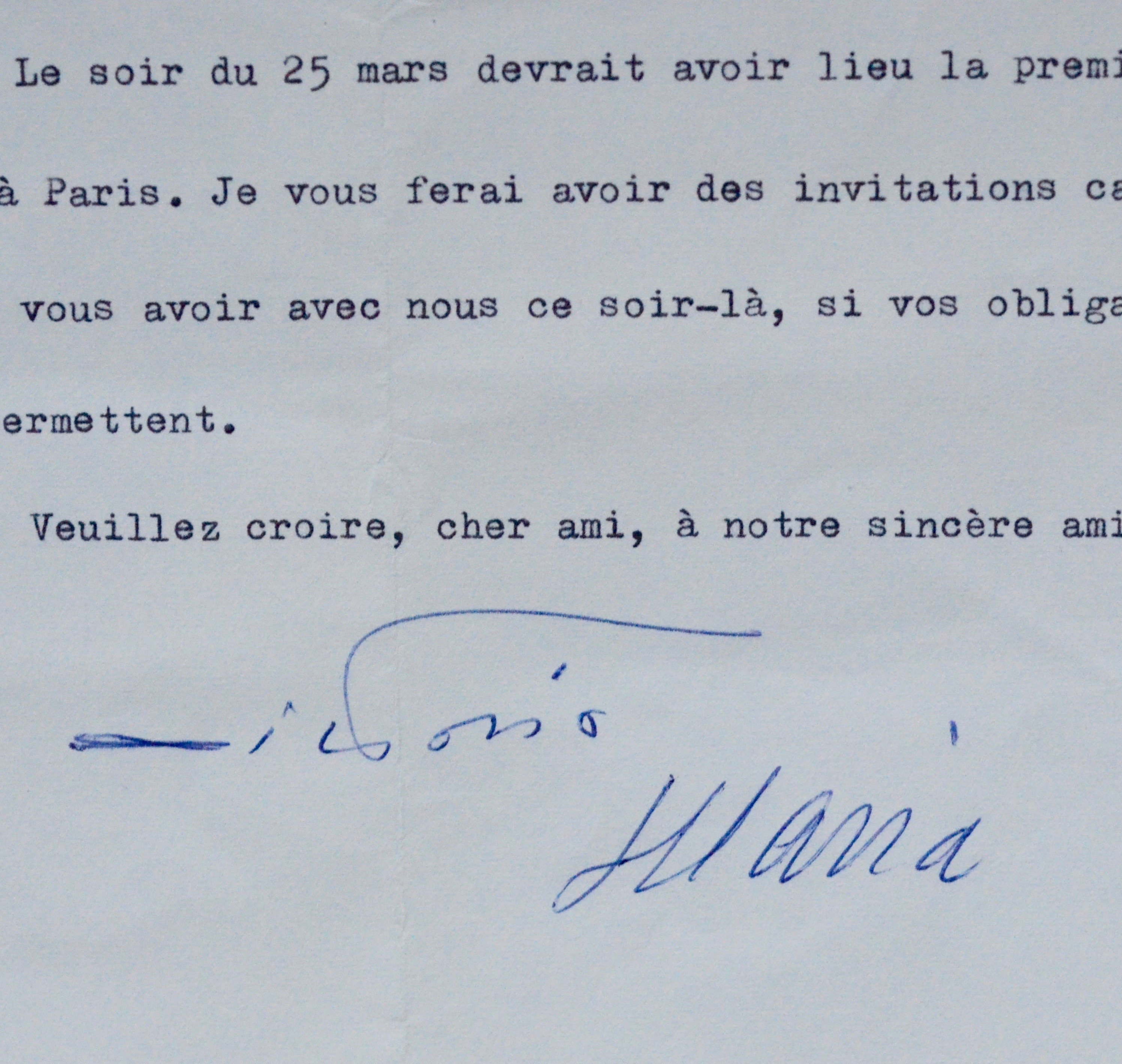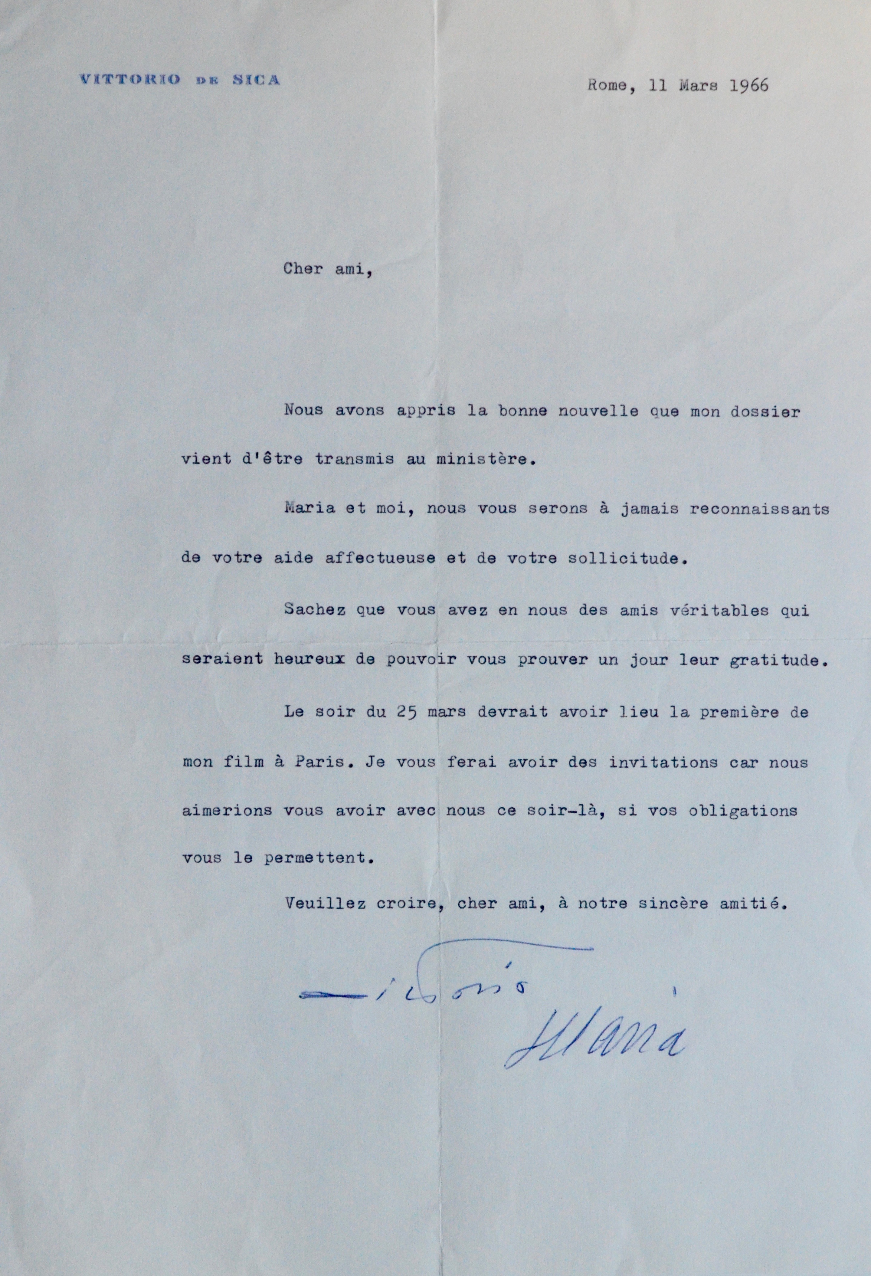 Vittorio De Sica remercie chaudement le parolier Louis Amade, pour la transmission d'un dossier. "[...] Maria [l'actrice espagnole Maria Mercader] et moi nous vous serons à jamais reconnaissants de votre aide affectueuse et de votre sollicitude. Sachez que vous avez en nous des amis véritables qui seraient heureux de pouvoir vous prouver un jour leur gratitude [...]". De Sica convie Amade à la première parisienne de son nouveau film, Un Nouveau Monde, sorti en France le 25 mars 1966. "Je vous ferai avoir des invitations car nous aimerions vous avoir avec nous ce soir-là".