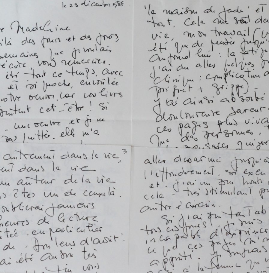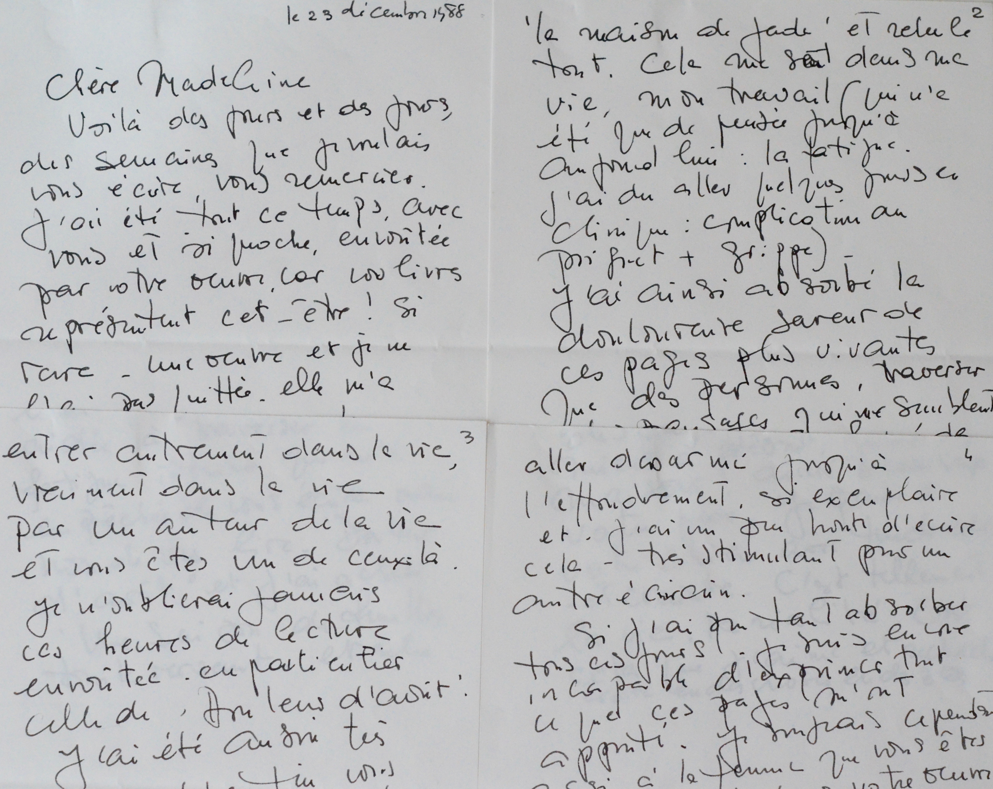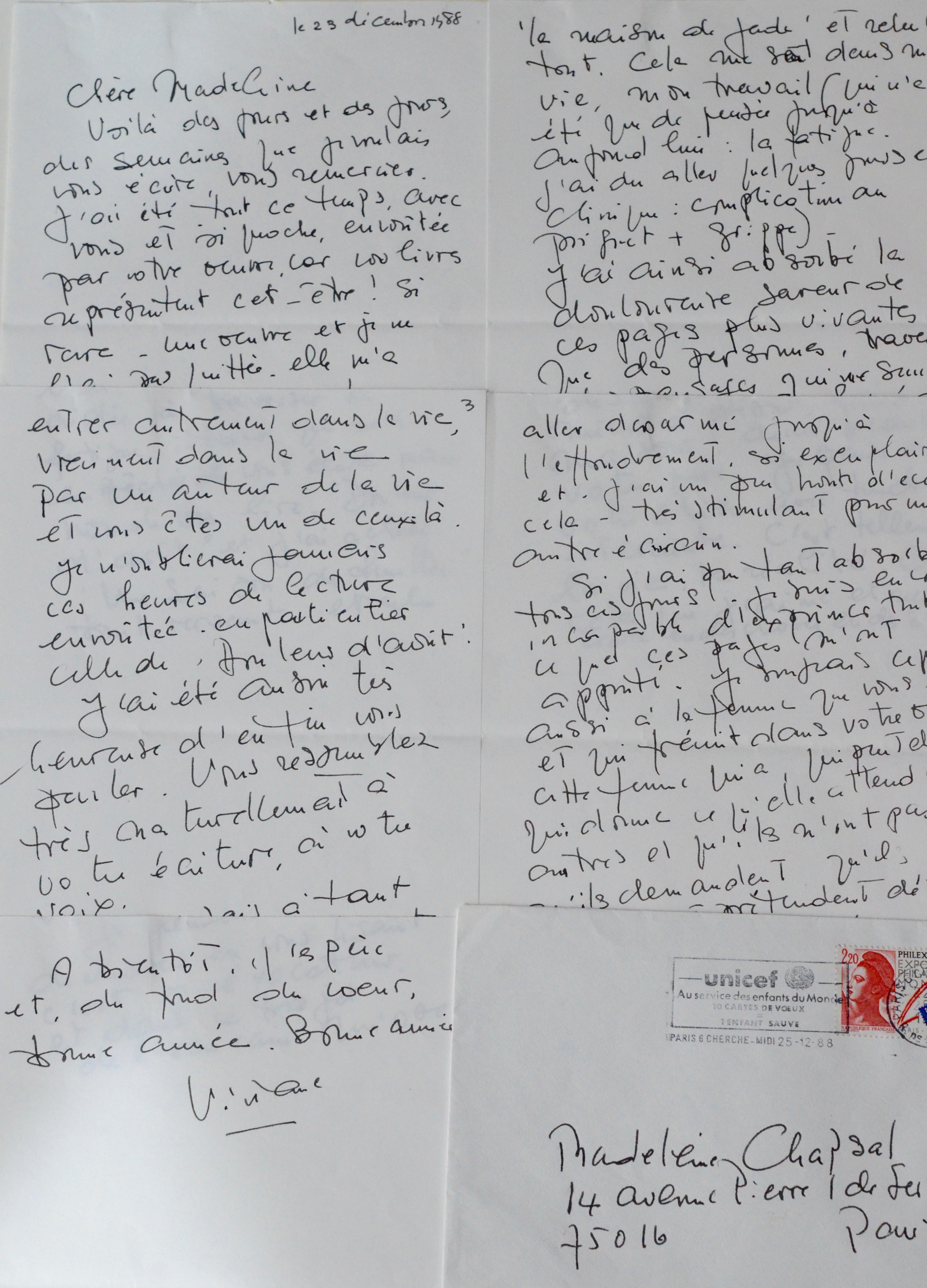 "[...] J'ai été tout ce temps, avec vous et si proche, envoutée par votre oeuvre, car vos livres représentent cet être ! Si rare [...] je ne l'ai pas quitté. Elle m'a aidé à traverser la fatigue intense qui m'a empêché de vous écrire mais non pas de vous lire [...]". Elle évoque Douleur d'août, Une saison de feuilles et La Maison de Jade. Elle détaille avec poésie tout ce qu'elle a aimé dans ces ouvrages "C'est tellement la vie. La réalité. C'est cela que j'aime et recherche : croire en des choses, en des êtres, entrer autrement dans la vie, vraiment dans la vie et être un de ceux-là. Je n'oublierai jamais ces heures de lecture envoutée [...]". Elle évoque ses problèmes de santé et disserte sur les qualités d'écrivain de Chapsal. Belle lettre.