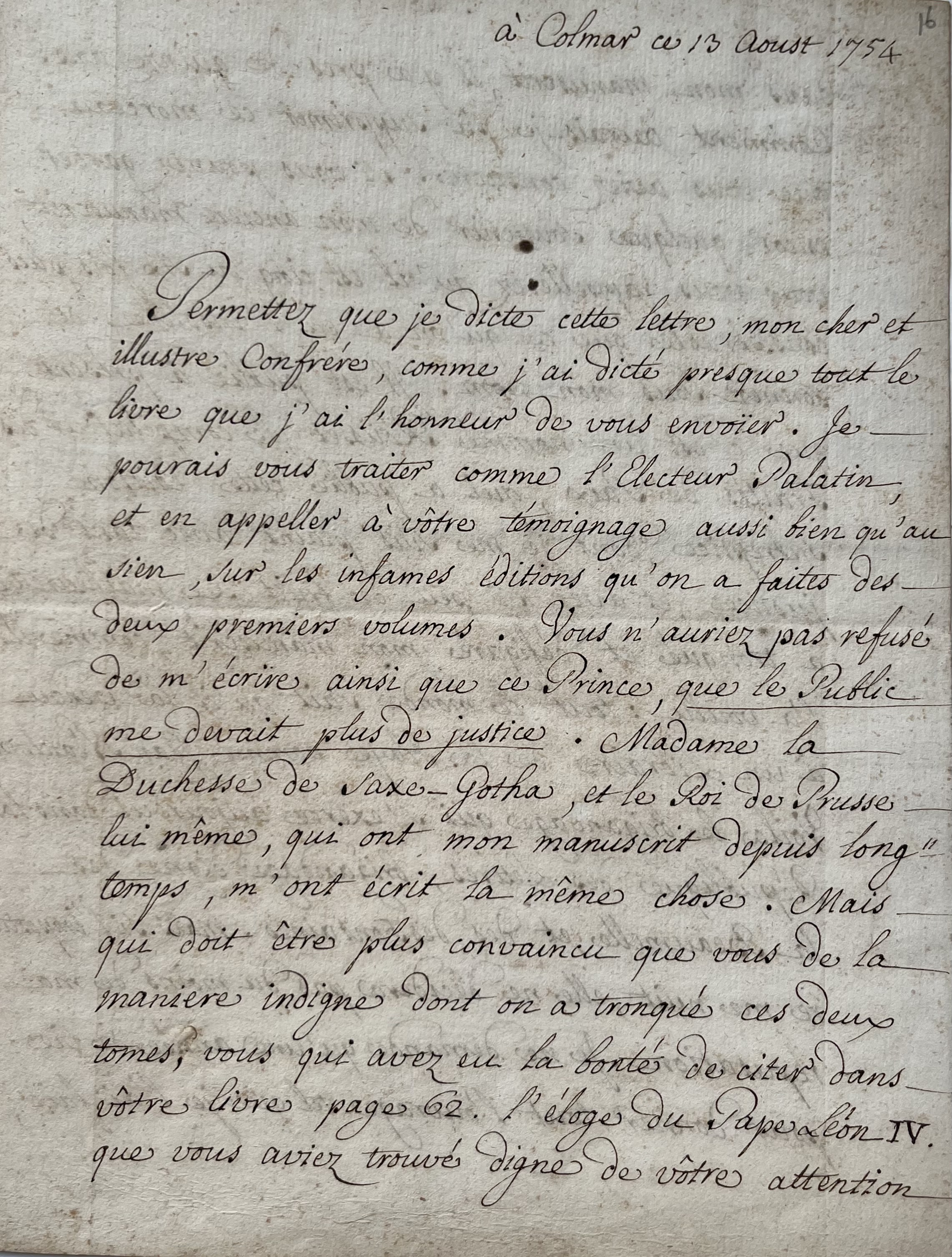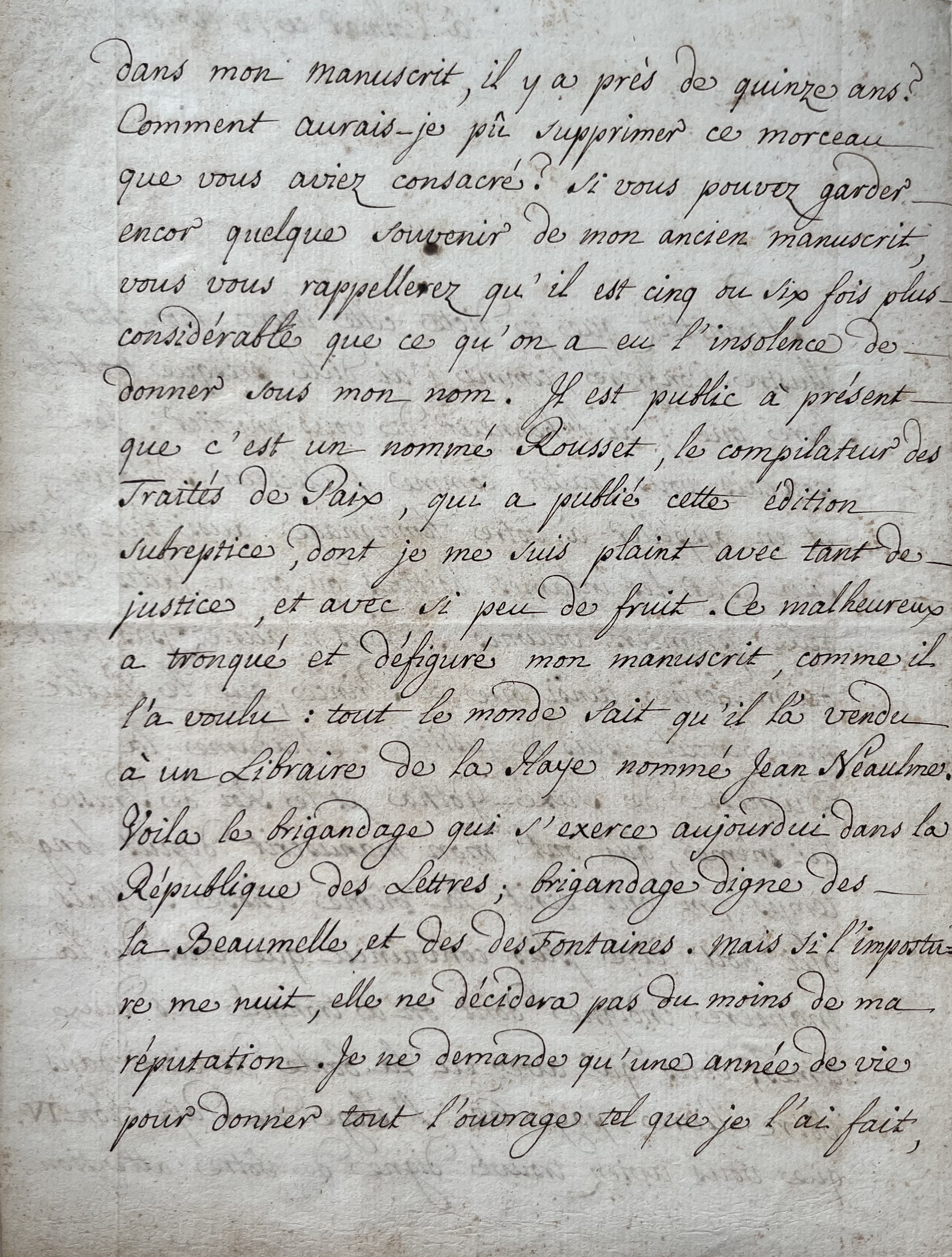 "Permettez que je dicte cette lettre, mon cher et illustre confrère, comme j'ai dicté presque tout le livre que j'ai l'honneur de vous envoïer. Je pourrais vous traiter comme l'Electeur Palatin, et en appeler à votre témoignage aussi bien qu'au sien, sur les infames éditions qu'on a faites des deux premiers volumes. Vous n'auriez pas refusé de m'écrire, ainsi que ce Prince, que le public me devait plus de justice. Mme la duchesse de Saxe-Gotha, et le roi de Prusse lui-même, qui ont mon manuscrit depuis longtemps , m'ont écrit la même chose [...]". Voltaire évoque les passages qui ont été tronqués et s'en indigne. "Mais qui doit être plus convaincu que vous de la manière indigne dont on a tronqué ces deux tomes, vous qui avez eu la bonté de citer dans votre livre page 62 l'éloge du Pape Léon IV que vous aviez trouvé digne de votre attention dans mon manuscrit, il y a près de quinze ans? Comment aurais-je pu supprimer ce morceau que vous aviez consacré? Si vous pouvez garder encor quelque souvenir de mon ancien manuscrit, vous vous rappellerez qu'il est cinq ou six fois plus considérable que ce qu'on a eu l'insolence de donner sous mon nom. Il est public à présent que c'est un nommé Rousset, le compilateur des traités de Paix, qui a publié cette édition subreptice, dont je me suis plaint avec tant de justice, et avec si peu de fruit. Ce malheureux a tronqué et défiguré mon manuscrit, comme il a voulu : tout le monde sait qu'il l'a vendu à un libraire de La Haye nommé Jean Néaulme. Voilà le brigandage qui s'exerce aujourd'hui dans la république des lettres; brigandage digne des La Beaumelle, et des Desfontaines. Mais si l'imposture me nuit, elle ne décidera pas du moins de ma réputation. Je ne demande qu'une année de vie pour donner tout l'ouvrage tel que je l'ai fait, et j'ose dire tel qu'il mérite de paraître [...]".