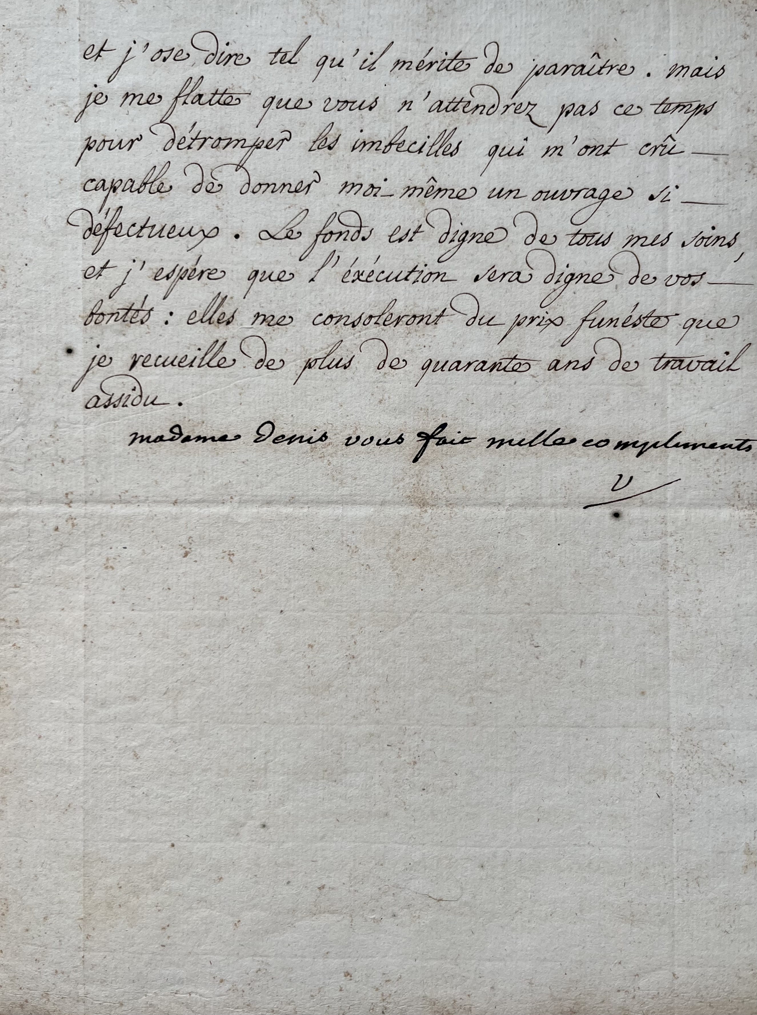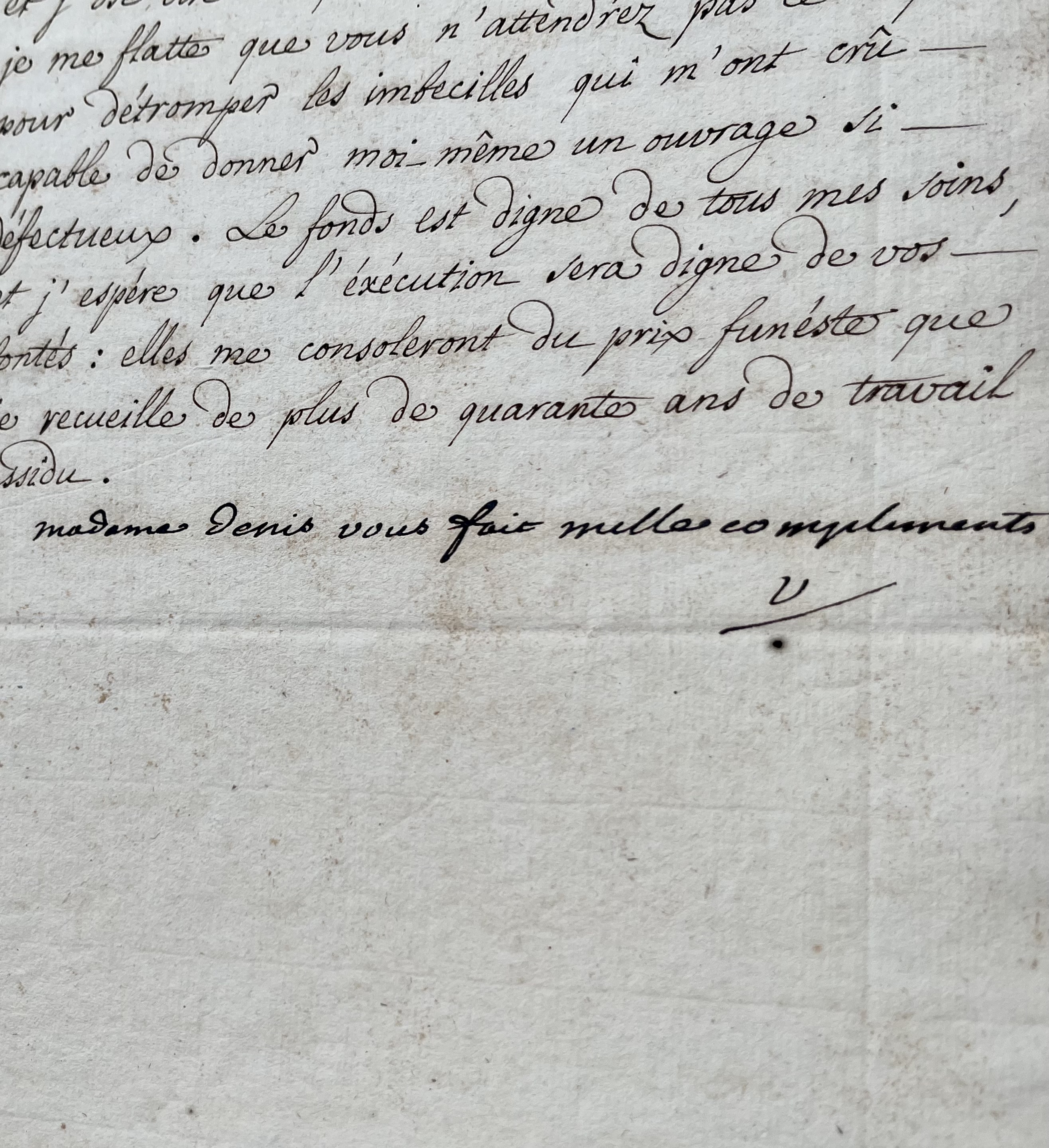 Voltaire a ajouté de sa main: « Madame Denis vous fait mille compliments. V. »
