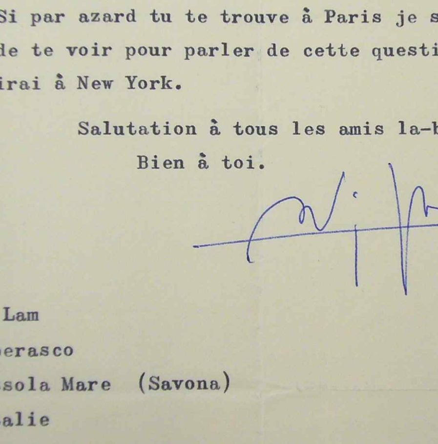 Wifredo Lam dit regretter de ne pas avoir trouvé Georges Fall à Paris lorsqu'il y était. "Sur l'édition en anglais pour le public américain j'ai écrit à mon marchand à New York qui, pour le moment, se trouve à Paris où je le verrai le 25 de ce mois et je lui parlerai de nouveau de cette affaire. Si par hasard tu te trouves à Paris, je serai très content de te voir pour parler de cette question ou bien je t'écrirai à New York. Salutations à tous les amis là-bas".