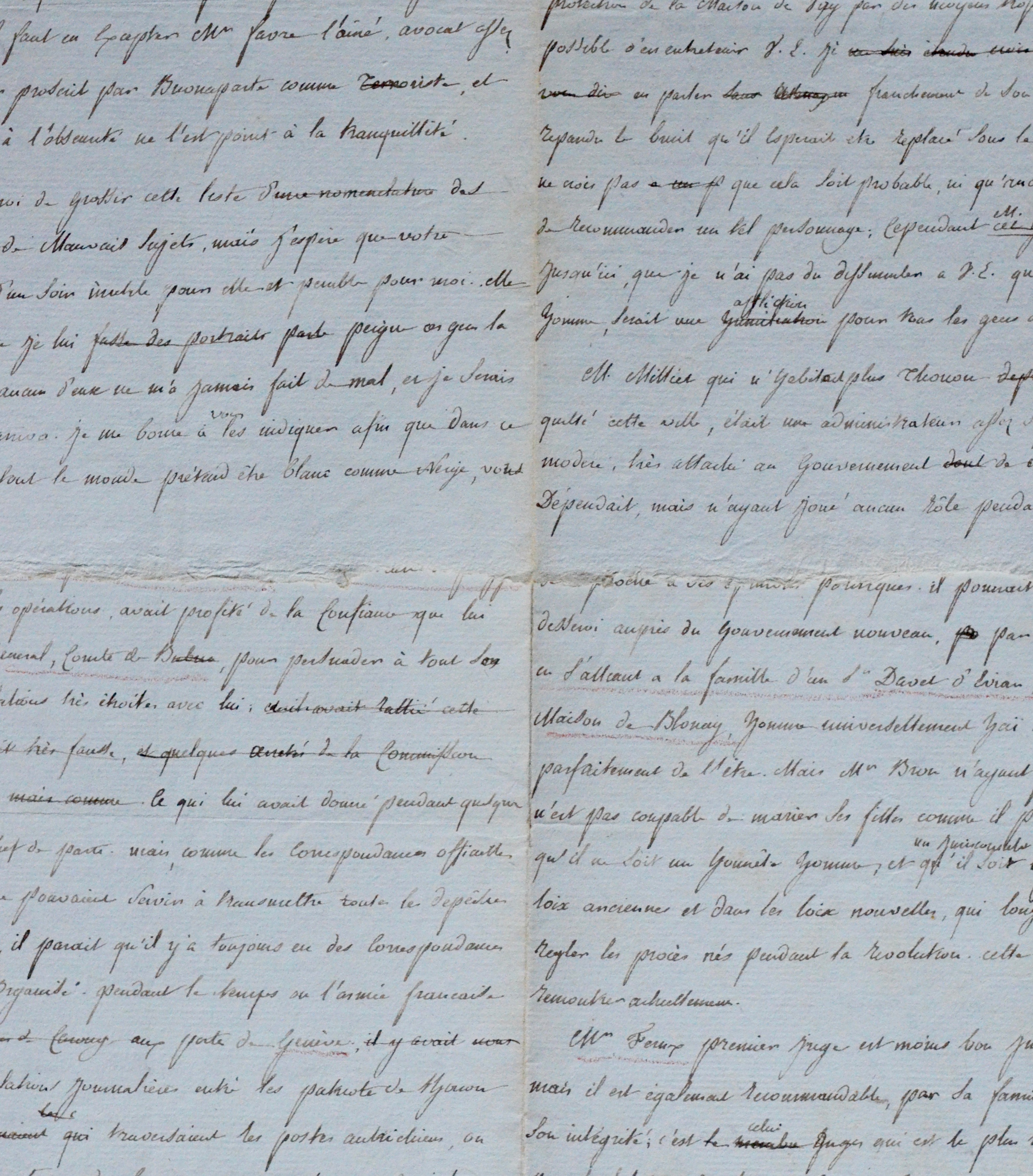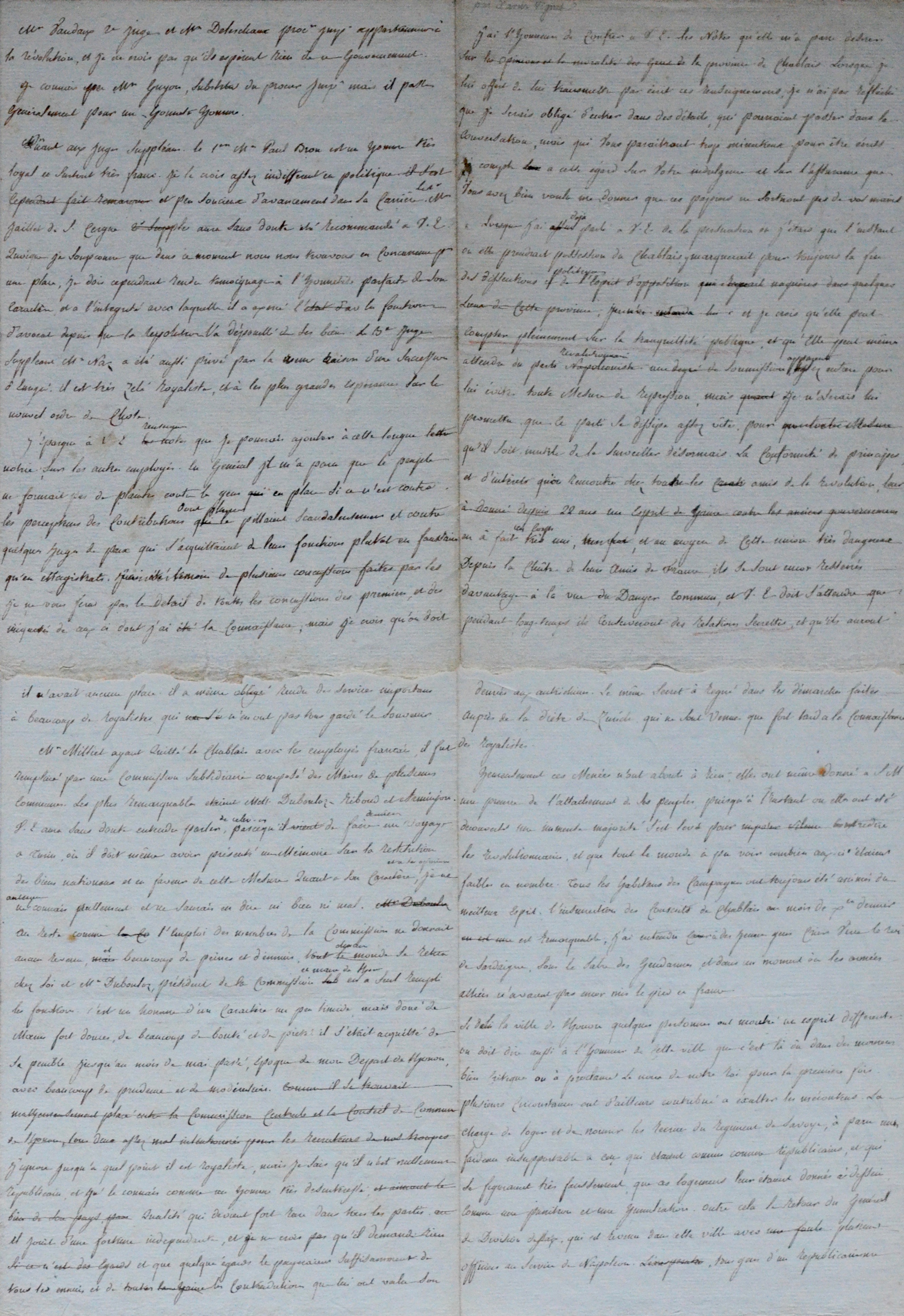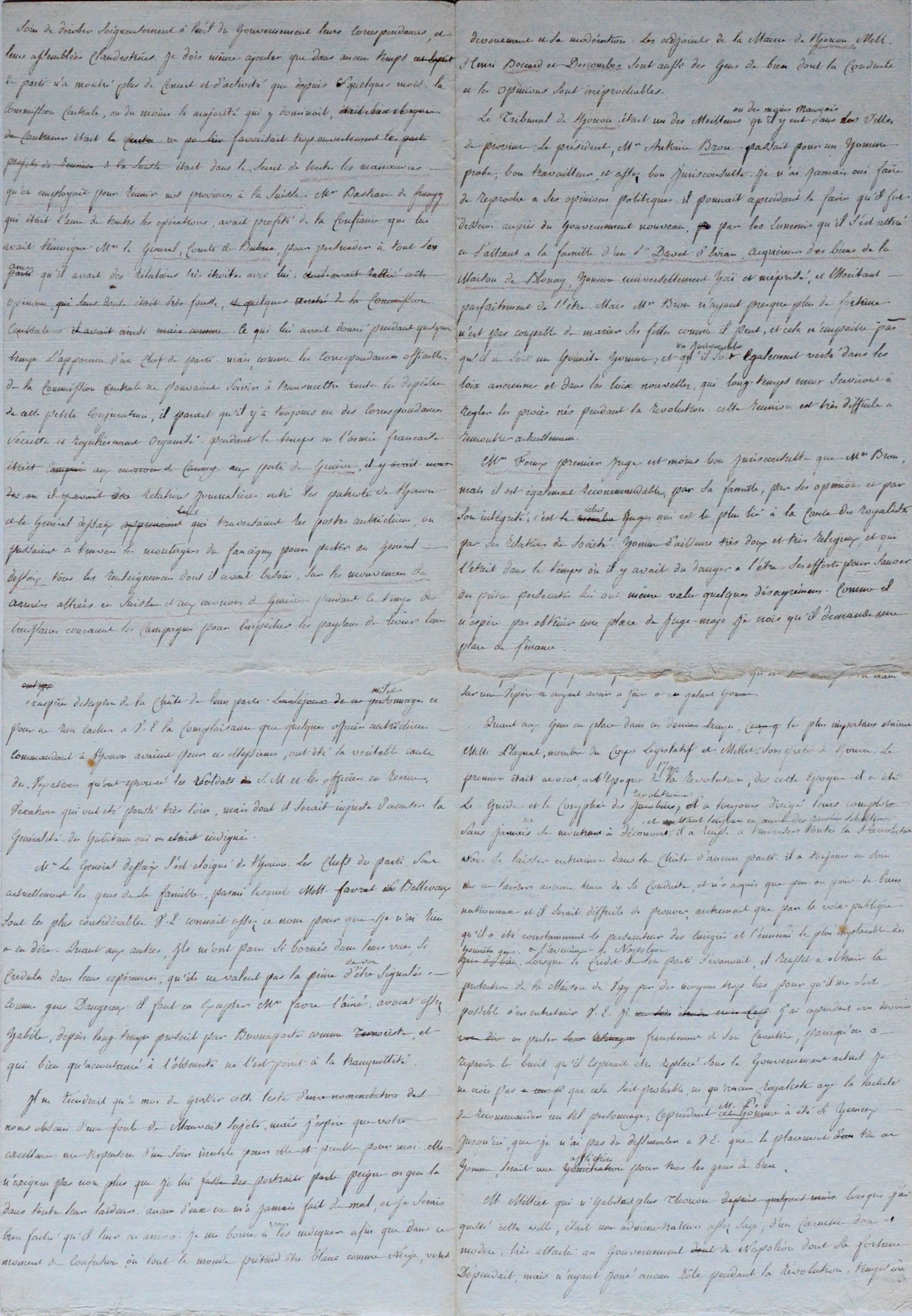 Très intéressant rapport sur les opinions et la moralité des habitants de la province du Chablais au début de la Restauration. "J'ai l'honneur de confier à V.E. les notes qu'elle m'a paru désirer sur les opinions et la moralité de la province de Chablais [...]. Vous avez bien voulu que ces papiers ne sortiront pas de vos mains […]". Vignet dresse un rapport sur la moralité et l'état d'esprit des personnes influentes de la province du Chablais, et de Thonon en particulier. "Mr Ferny premier juge est moins bon jurisconsulte que Mr Bron, mais il est également recommandable, par sa famille, par ses opinions et par son intégrité ; c'est celui des juges qui est le plus lié à la cause des royalistes par ses relations de société. Homme d'ailleurs très doux et très religieux, et qui l'était dans le temps où il y avait du danger à l'être. Ses efforts pour sauver des prêtres persécutés lui ont même valu quelques désagréments […]".