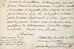 Lettre de N. Xhrouet, éditeur, imprimeur et directeur du Journal de Paris, premier quotidien français fondé en 1777. "Il n'y a absolument aucune difficulté à vous faire parvenir le Journal de Paris que vous désirez. J'ay en conséquence l'honneur de vous adresser la feuille d'aujourd'hui, et les suivantes vous seront remises exactement. Je joins ici la quittance d'abonnement, en vous priant d'avoir la complaisance d'en faire remettre le montant à la poste, franc de port, et de faire observer que M. de Laplace n'étant plus directeur du Journal de Paris depuis le mois de janvier dernier, c'est sous mon nom que le prix de l'abonnement doit être chargé à la poste", et signe "Xhrouet, directeur de Journal de Paris". Avec un reçu en partie imprimé, à l'en-tête du Journal de Paris, signé par Xhrouet, le 12 décembre 1778, de la somme de 24 livres pour une année d'abonnement au journal, à partir du 1er janvier 1779. Il est joint une autre lettre de Xhrouet au citoyen Eberts (an 9, en-tête du Bureau du journal Le Publiciste) sur la traduction de papiers allemands pour le journal. [Le Journal de Paris parut du 1er janvier 1777 au 17 mai 1840].