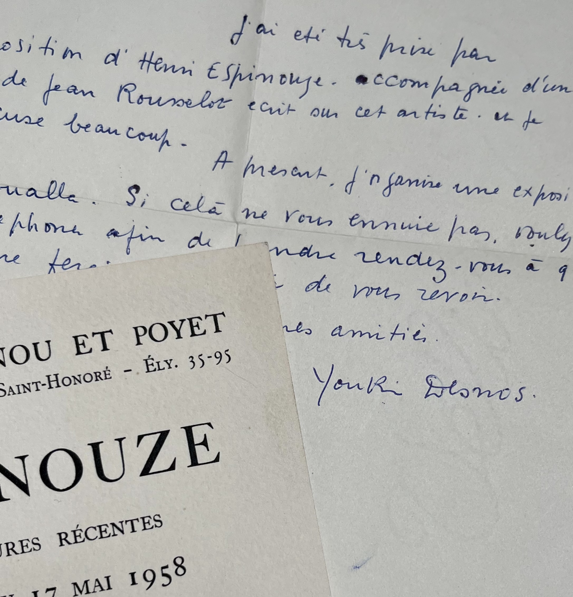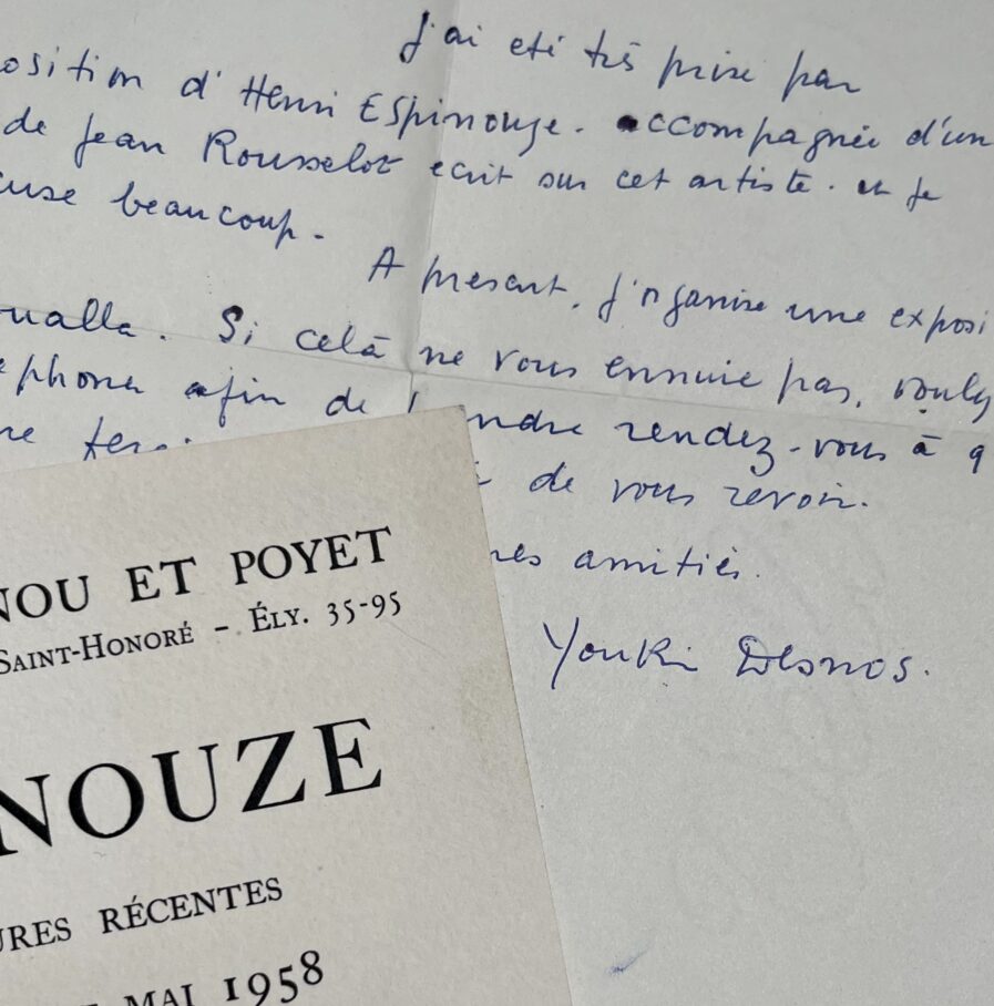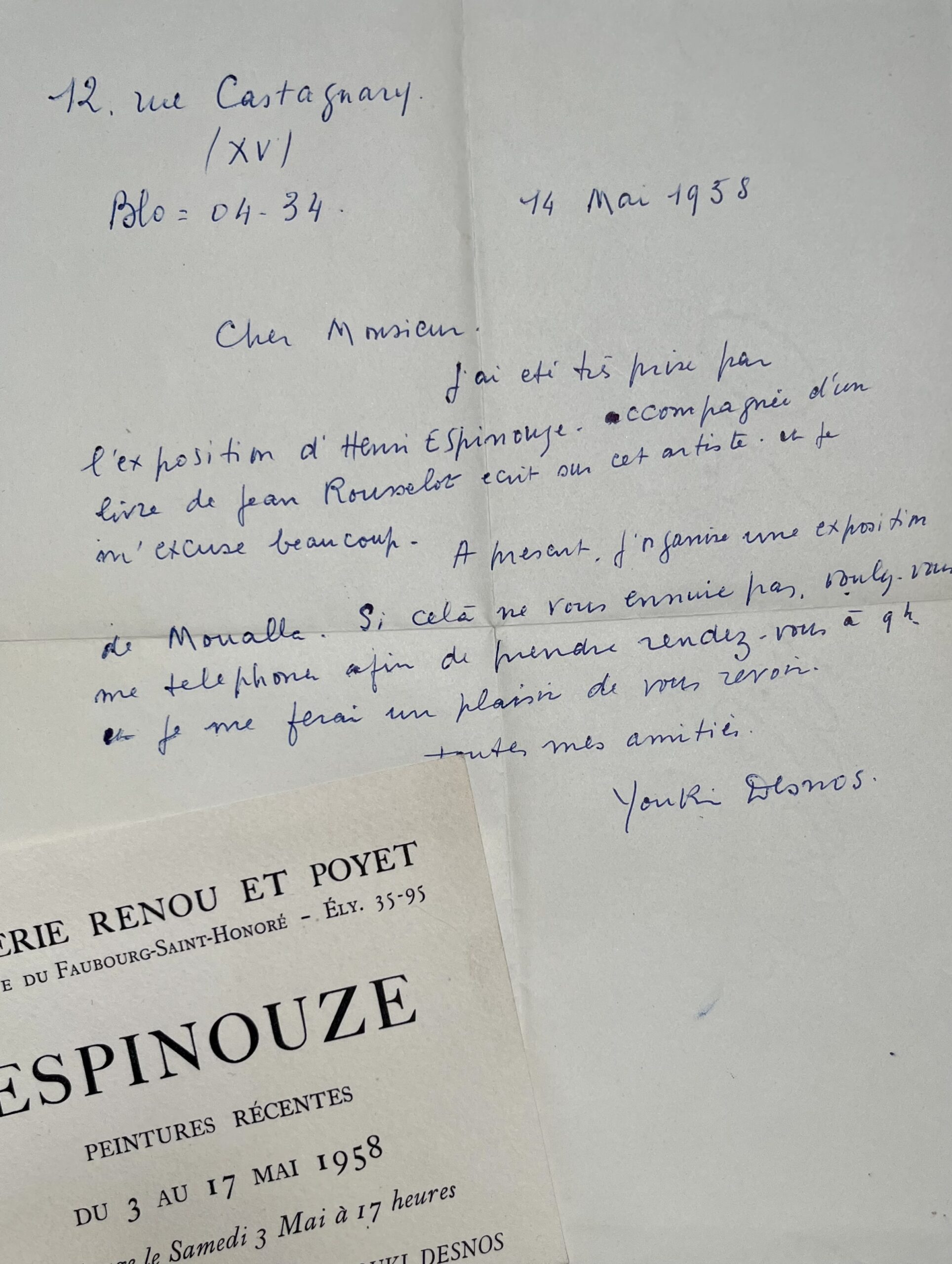 On joint un carton d’invitation à l’exposition en question "Espinouze - peintures récentes - du 3 au 17 mai 1958", organisée par Youki Desnos à la galerie Renou et Poyet.