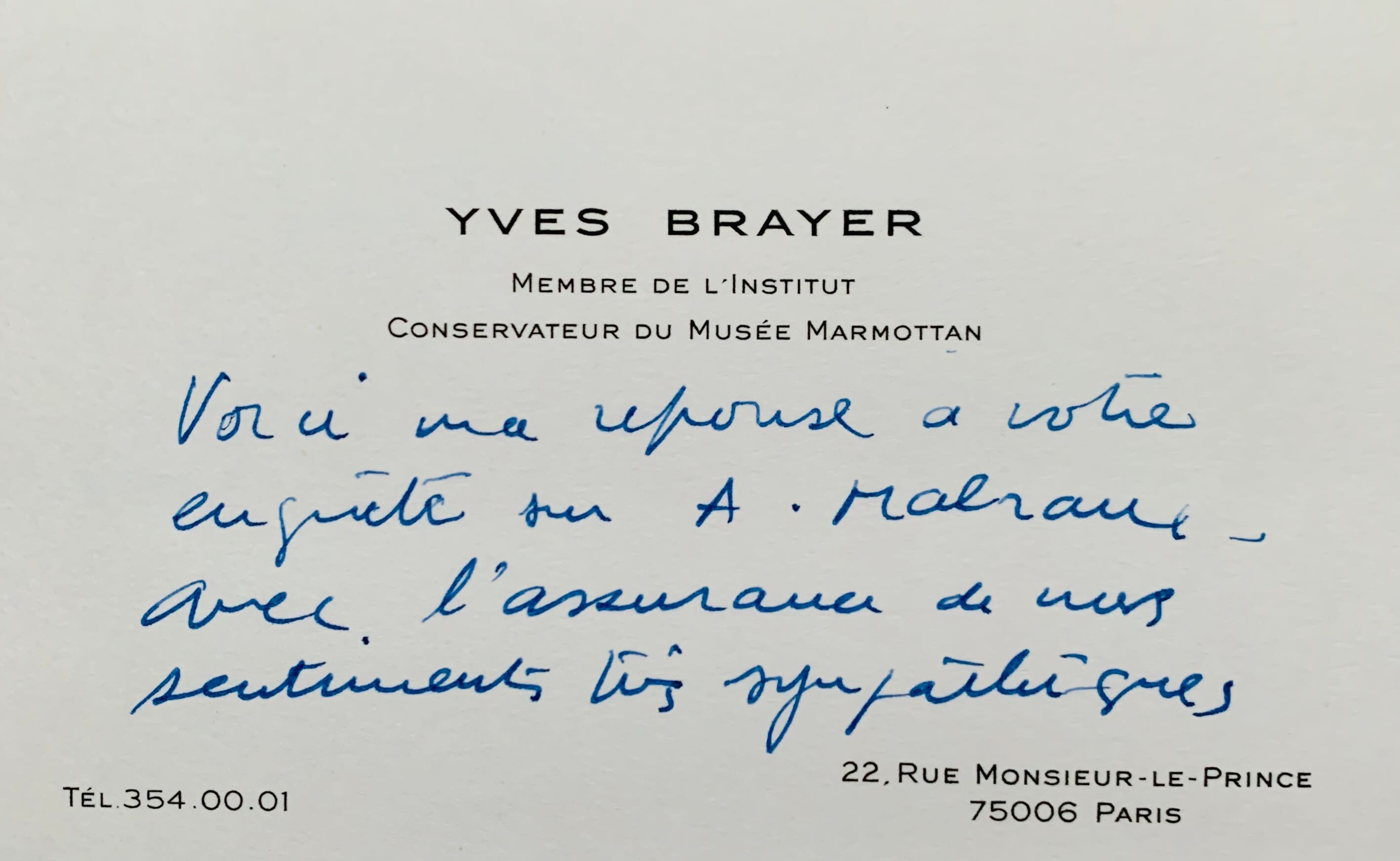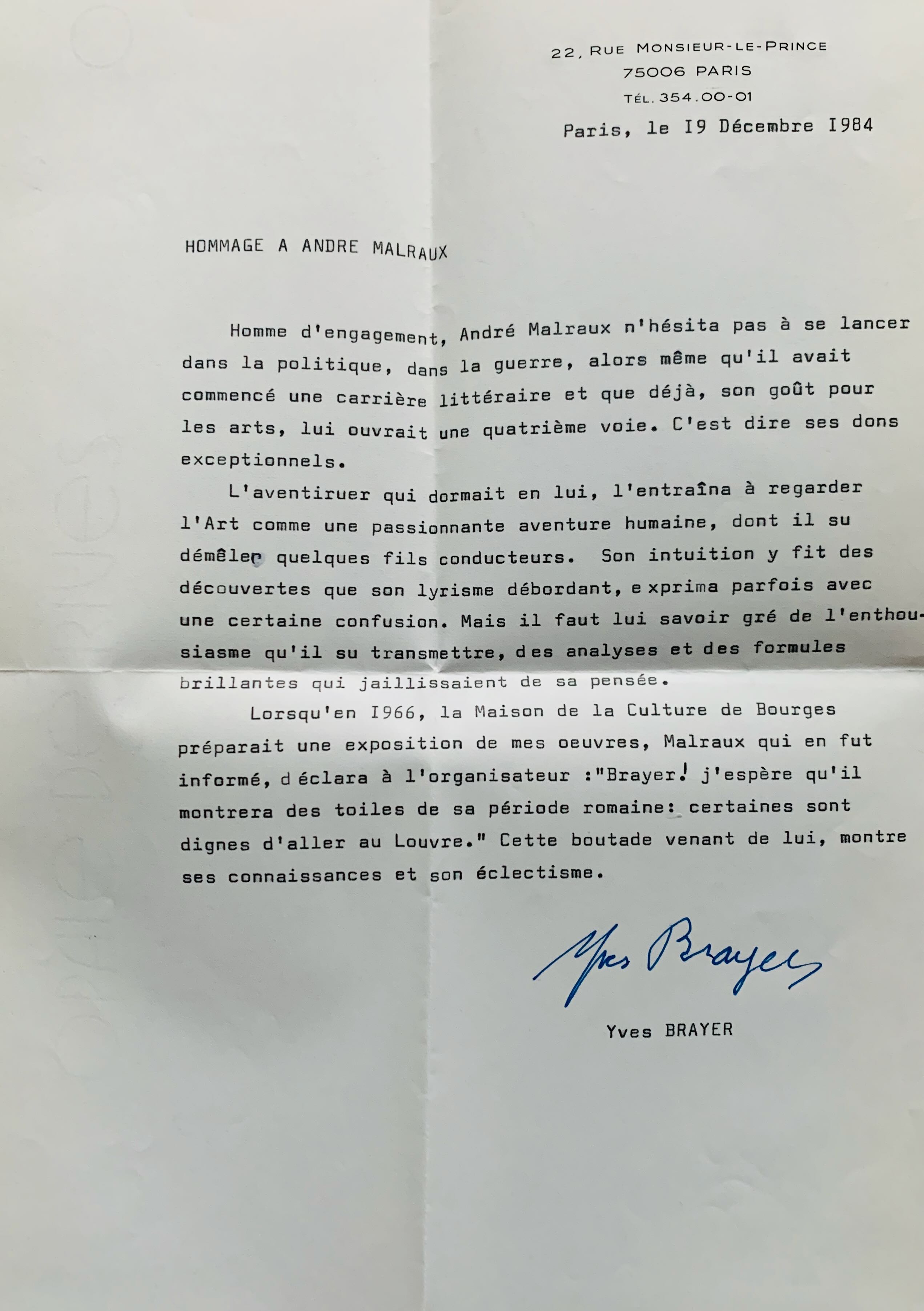 Texte rédigé par Yves Brayer dans le cadre d'un hommage à Malraux.