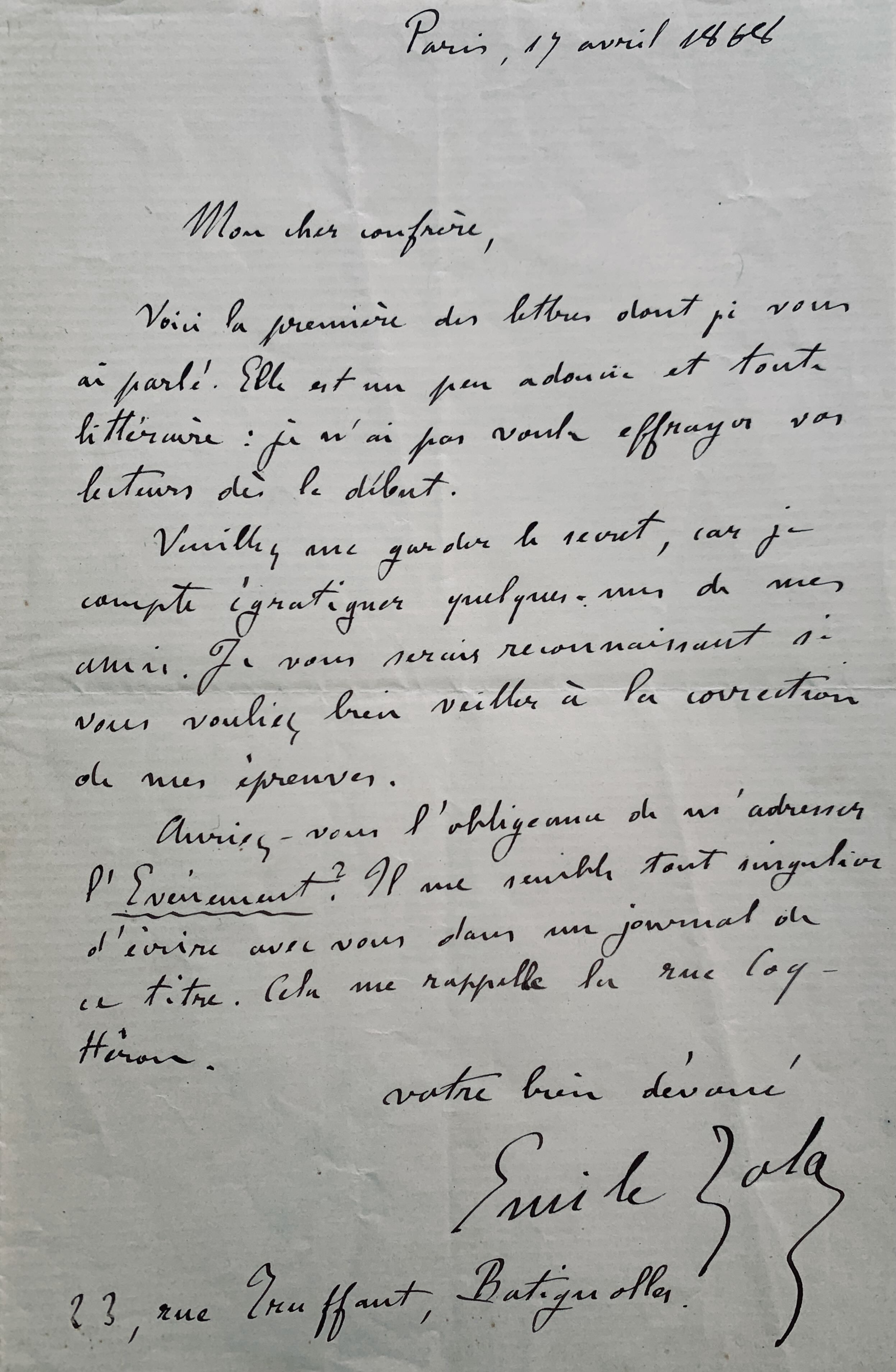 Amusante lettre de Zola, au sujet d'un article qu'il veut publier de manière anonyme, dans l'Évènement.