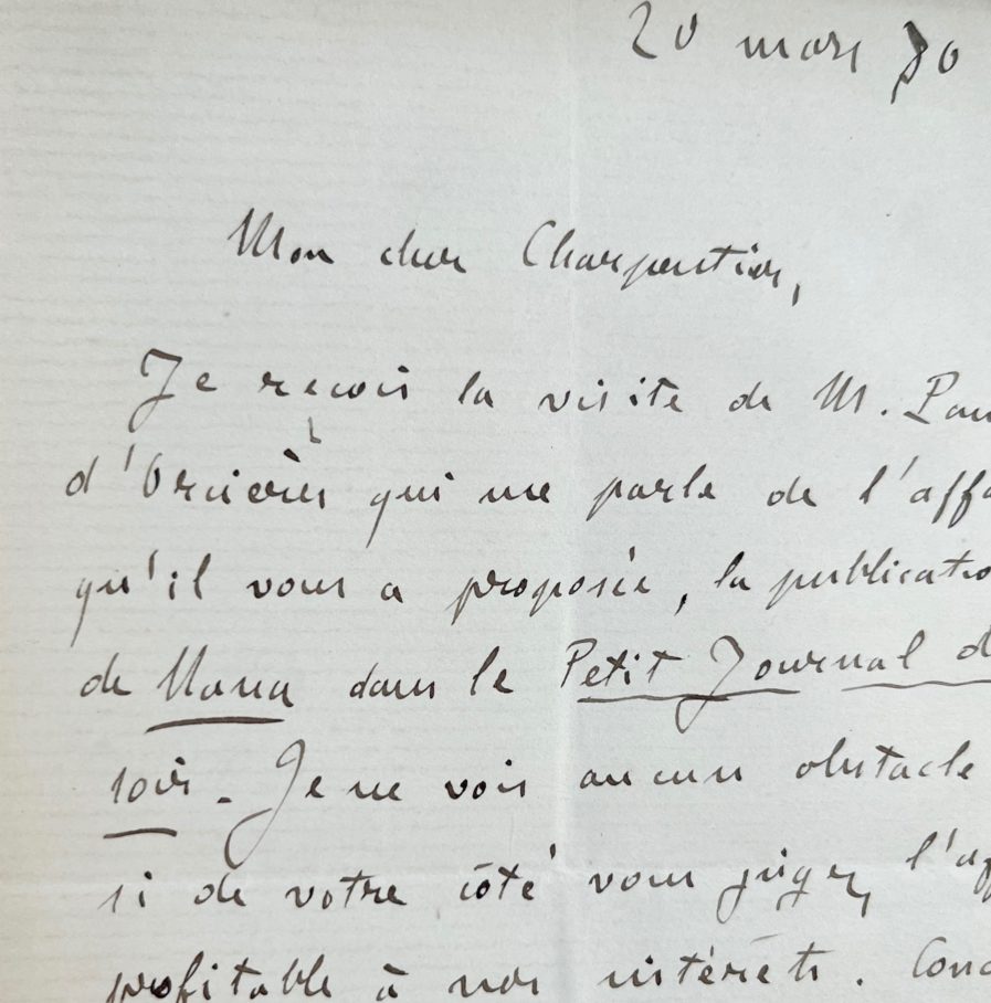 Je reçois la visite de M. Paul d'Orcières qui me parle de l'affaire qu'il vous a proposée, la publication de Nana dans la Petit Journal du soir. Je ne vois aucun obstacle, si de votre côté vous jugez l'affaire profitable à nos intérêts. Concluez-la donc, au prix de deux mille francs, à moins que vous n'ayez quelques observations particulières à me faire. Dans ce cas, attendez et donnez-moi un rendez-vous pour que nous en causions".