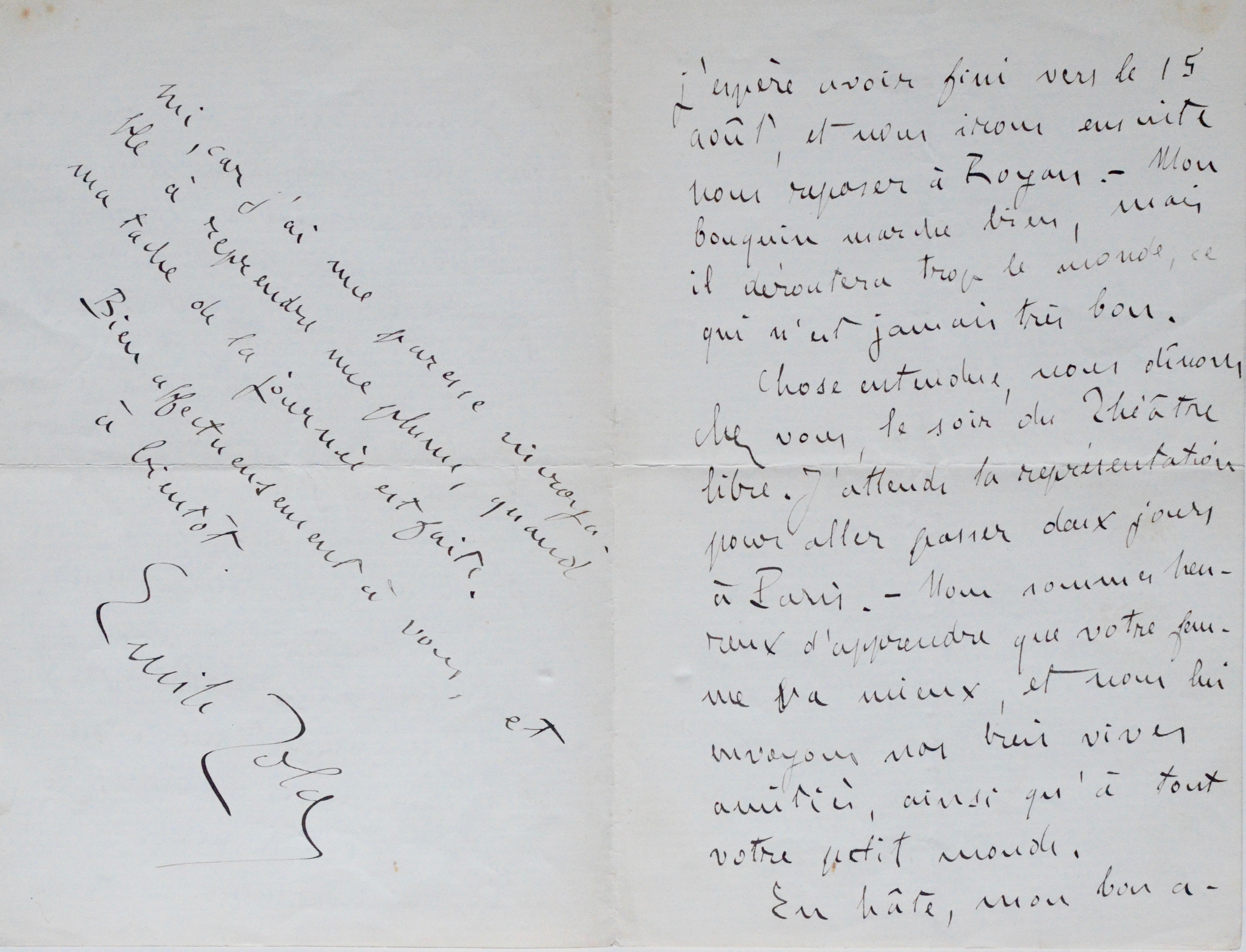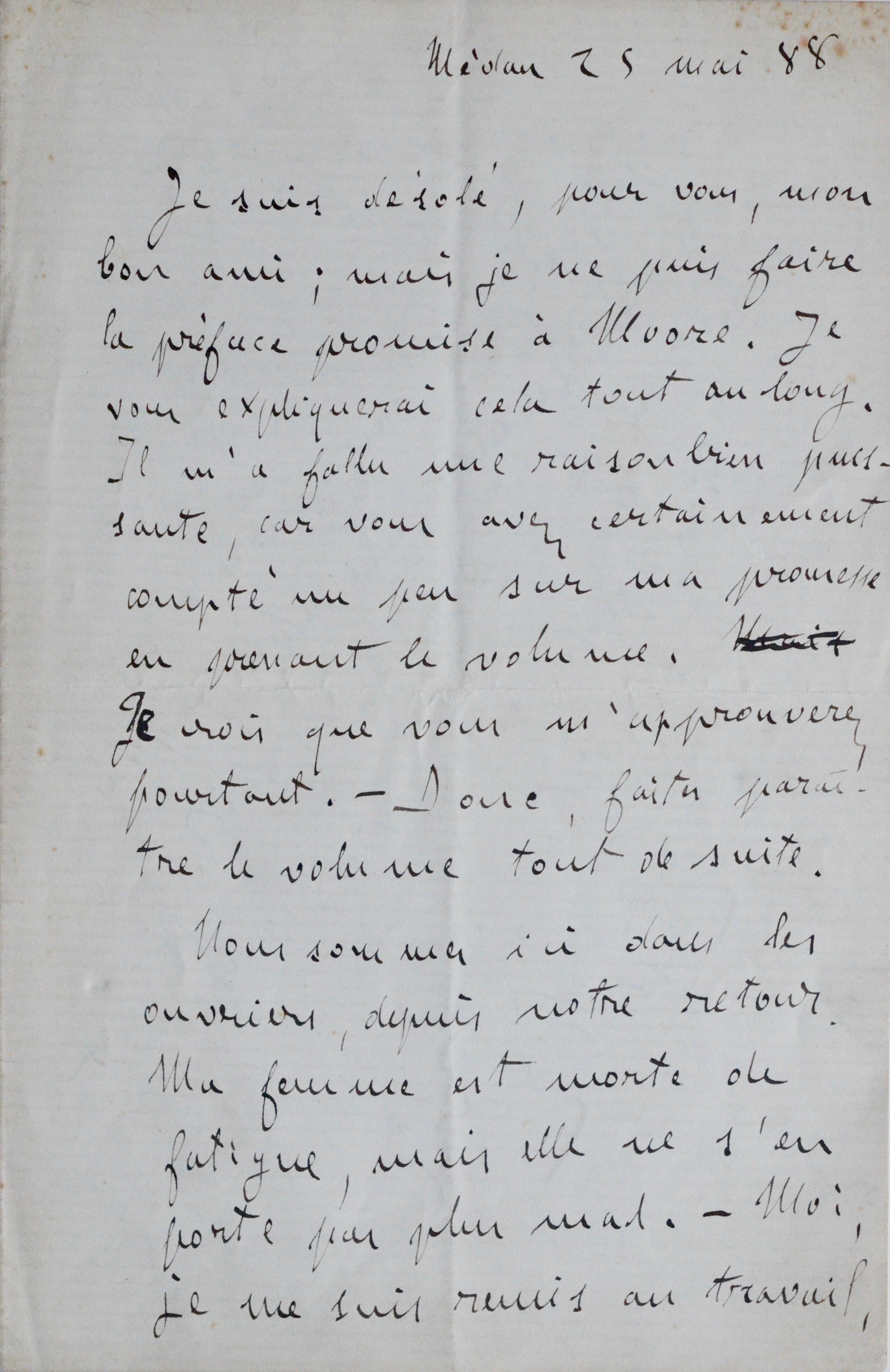 "Je suis désolé, pour vous, mon bon ami ; mais je ne puis faire la préface promise à Moore. Je vous expliquerai cela tout au long. Il m'a fallu une raison bien puissante, car vous avez certainement compté un peu sur ma promesse en prenant le volume. Je vois que vous m'approuverez pourtant. - Donc, faites paraître le volume toute de suite. Nous sommes ici dans les ouvriers, depuis notre retour. Ma femme est morte de fatigue, mais elle ne s'en porte pas plus mal. - Moi, je me suis remis au travail, j'espère avoir fini vers le 15 août, et nous irons ensuite nous reposer à Royan. - Mon bouquin marche bien, mais il déroutera trop le monde, ce qui n'est jamais très bon. Chose entendue, nous dînons chez vous, le soir du Théâtre libre. J'assiste à la représentation pour aller passer deux jours à Paris [...]". Heureux que la femme de son correspondant se porte mieux, Zola salue "tout votre petit monde. En hâte, mon bon ami, car j'ai une paresse incroyable à reprendre une plume, quand ma tache de la journée est faite".