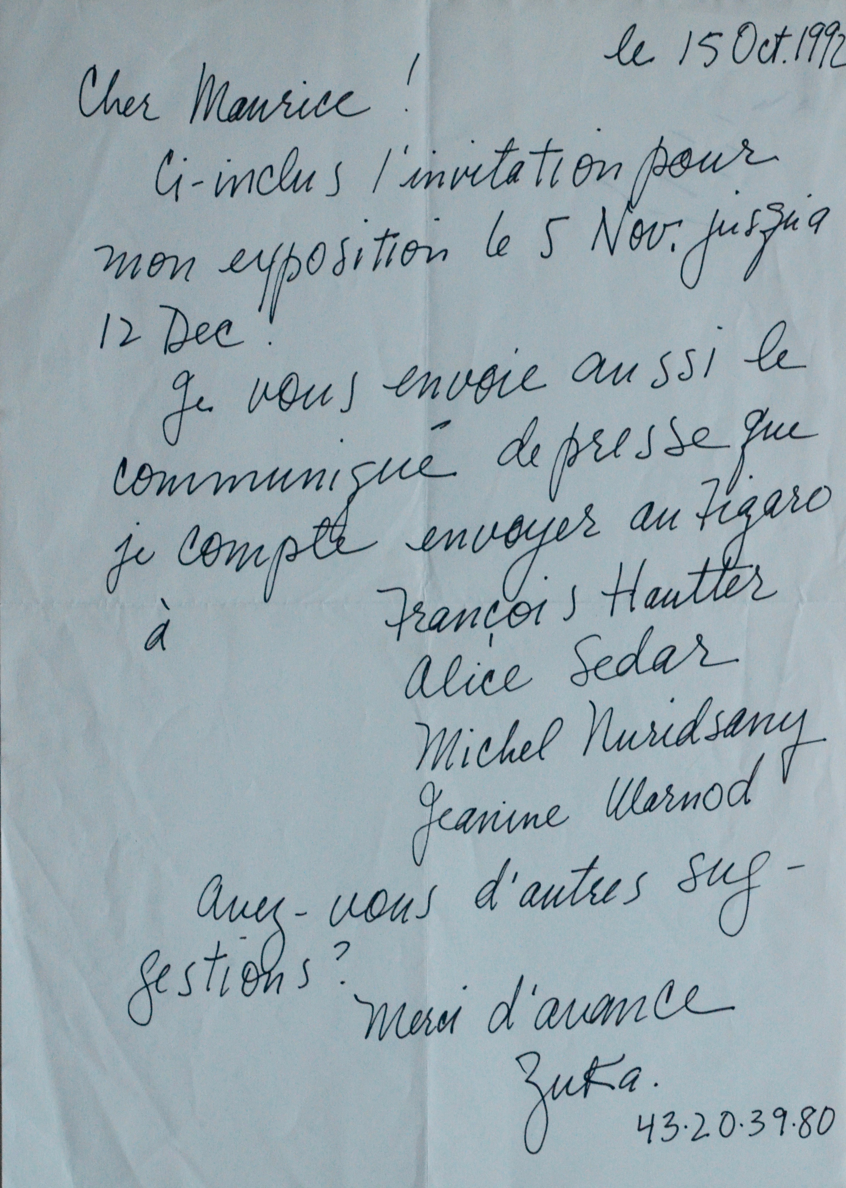 "Cher Maurice ! Ci-inclus l'invitation pour mon exposition le 5 nov. jusqu'à [sic] 12 dec. Je vous envoie aussi le communiqué de presse que je compte envoyer au Figaro à François Hautter, Alice Sedar, Michel Nuridsany, Jeanine Warnod. Avez-vous d'autres suggestions ? [...]".