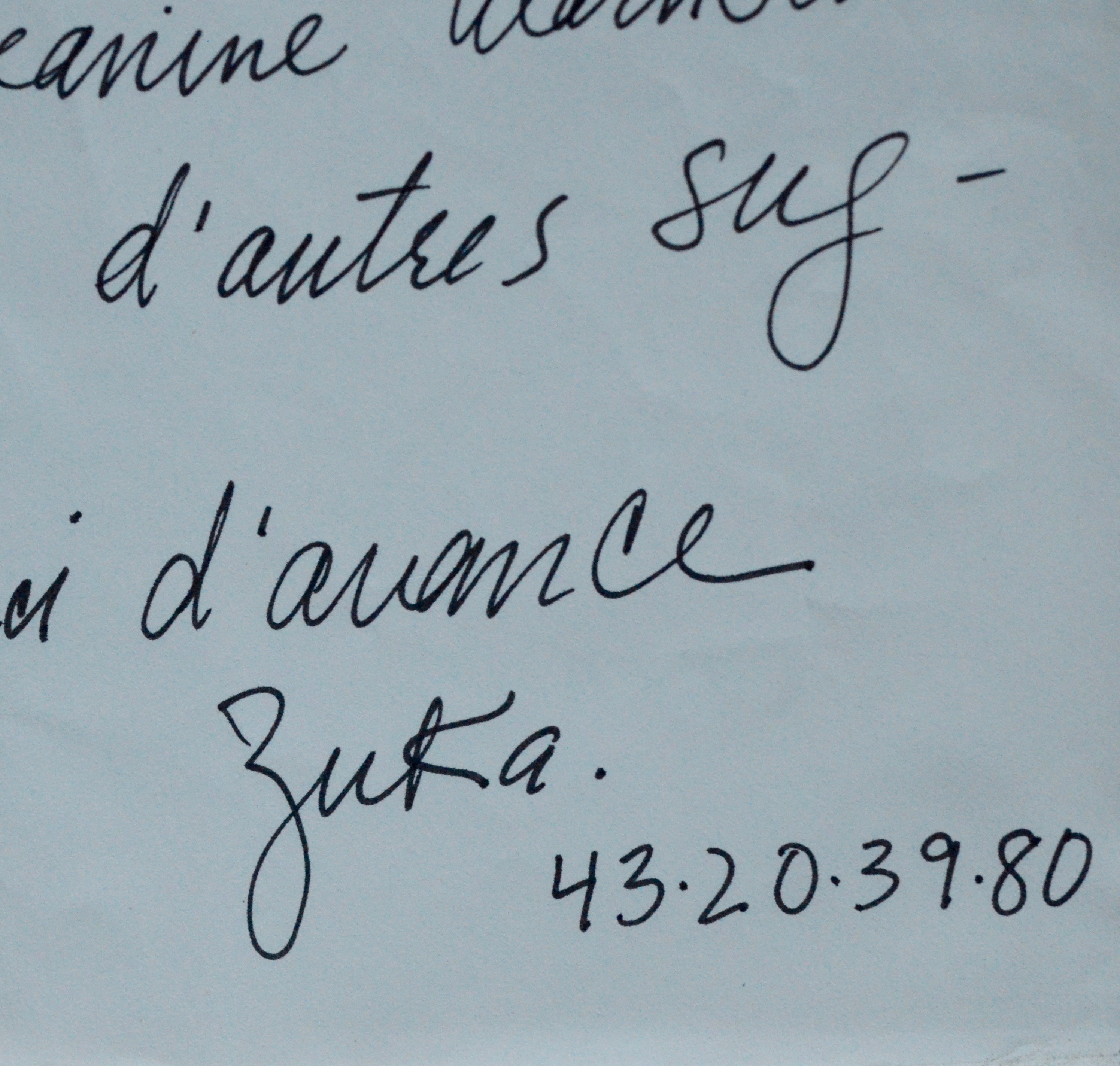 On joint une invitation à l'exposition de Zuka qui se tint à la Galerie Darthea Speyer, du 14 octobre au 20 novembre 1982. Adresse de Dalinval au verso avec marque postale.